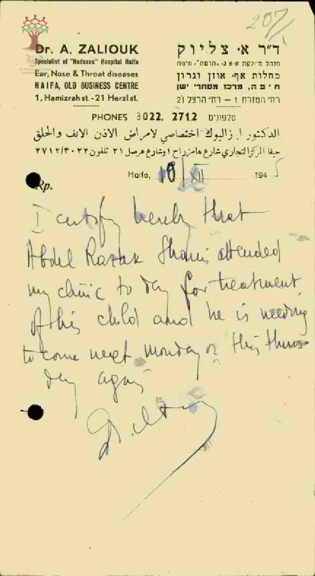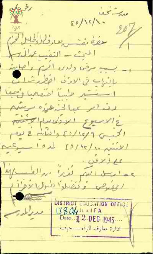 رسالة من المعلم عبد الرزاق الشامي الى مفتش المعارف بخصوص تغيبه لمدة اسبوعين مرفقة بالتقرير الطبي