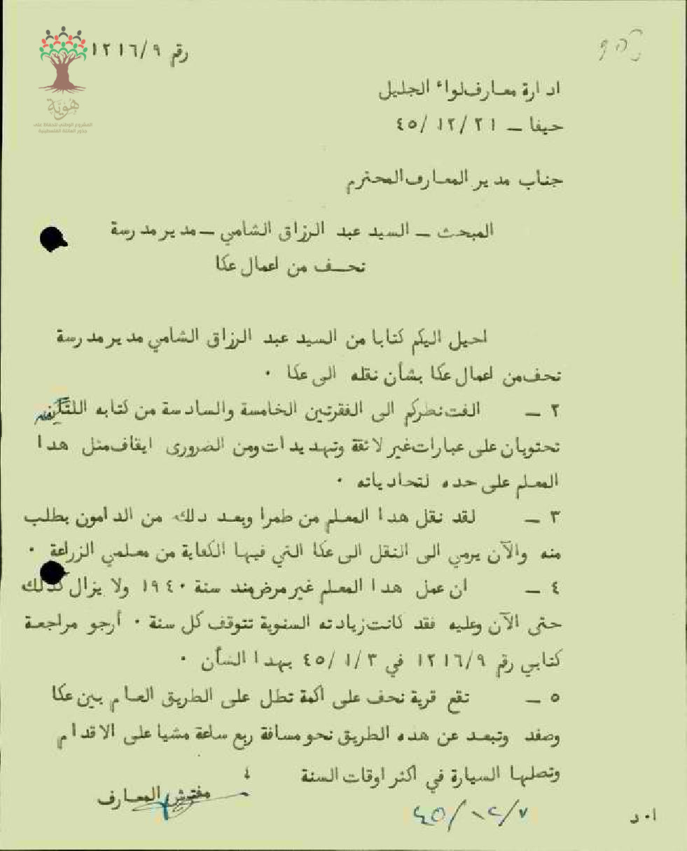 رسالة من مفتش المعارف الى مدير المعارف يبحث معه وضع المعلم عبد الرزاق الشامي