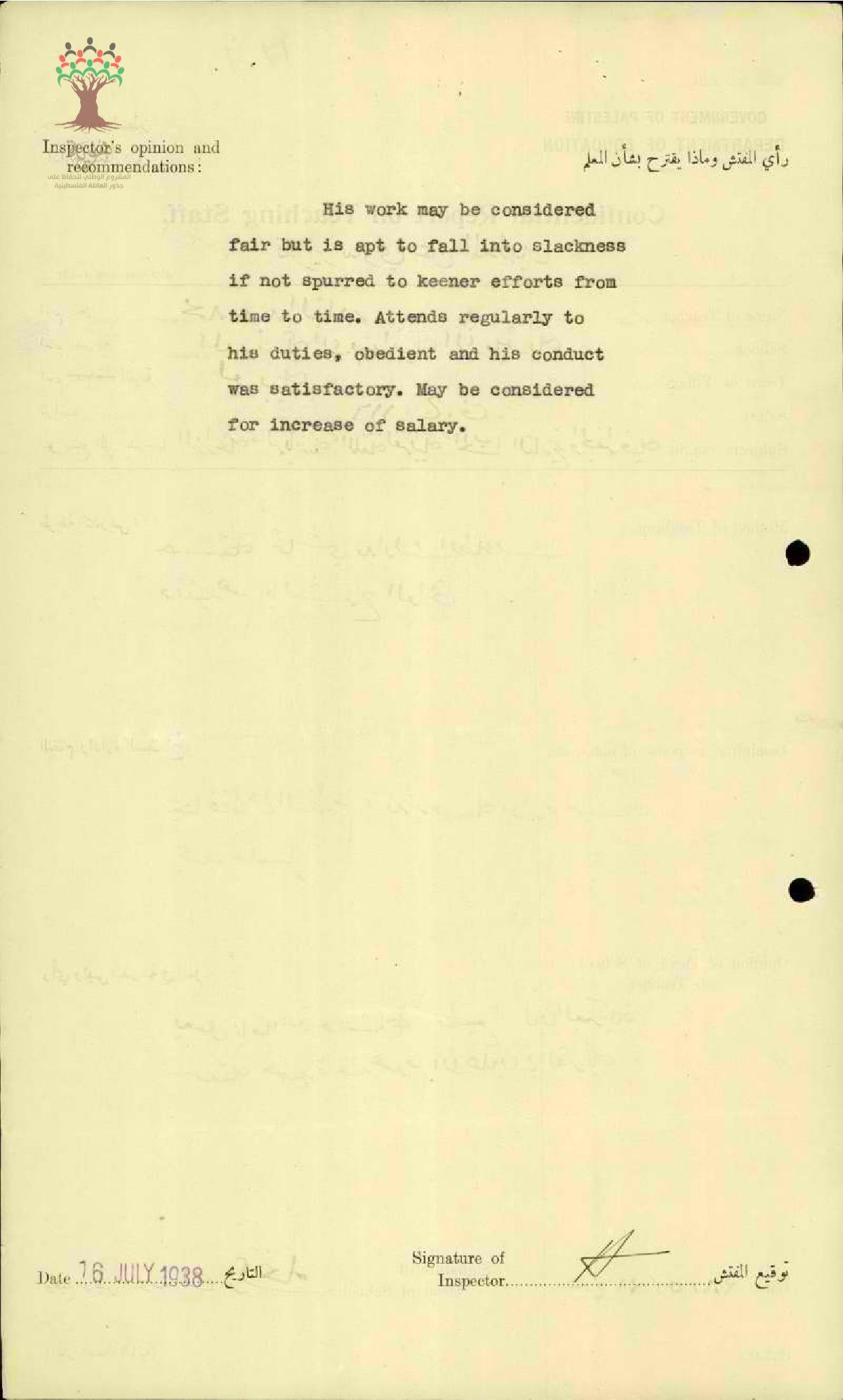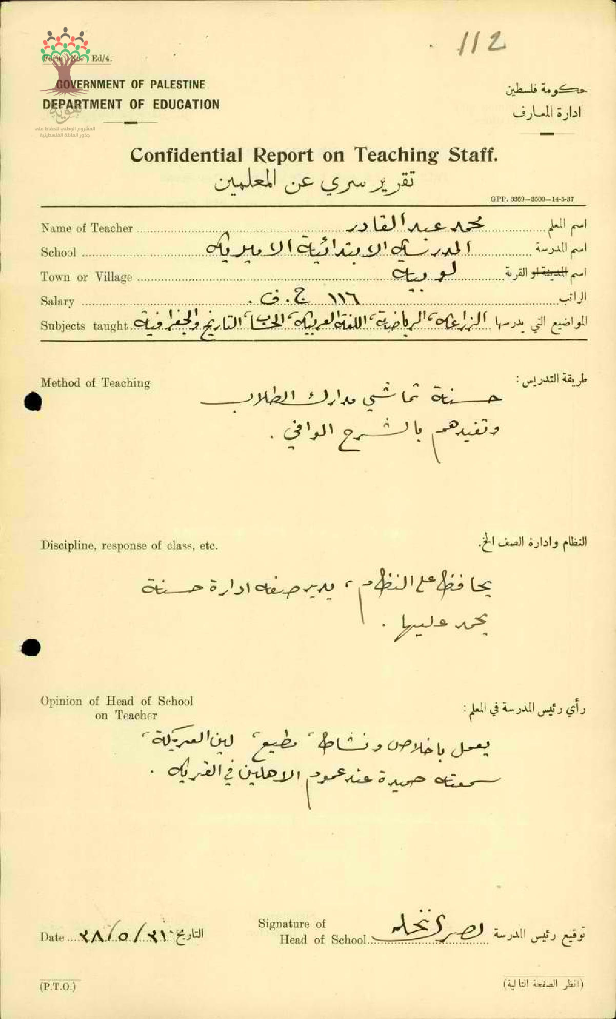 تقرير تفصيلي عن أداء المعلم محمد عكاشة في مدرسة لوبية سنة 1938