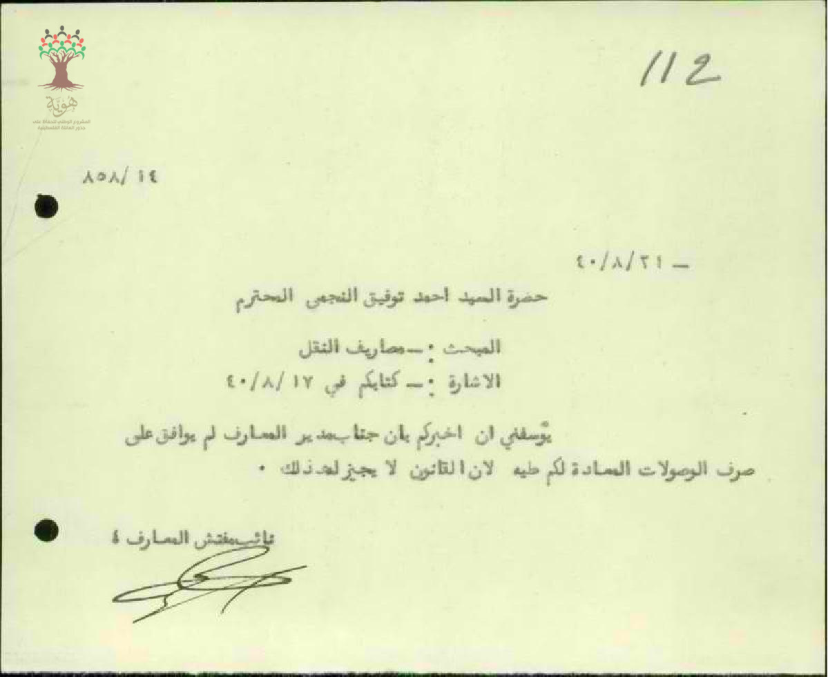 رسالة من نائب مفتش المعارف إلى السيد أحمد النجمي بعدم صرف الوصولات لأن القانون لا يسمح بذالك
