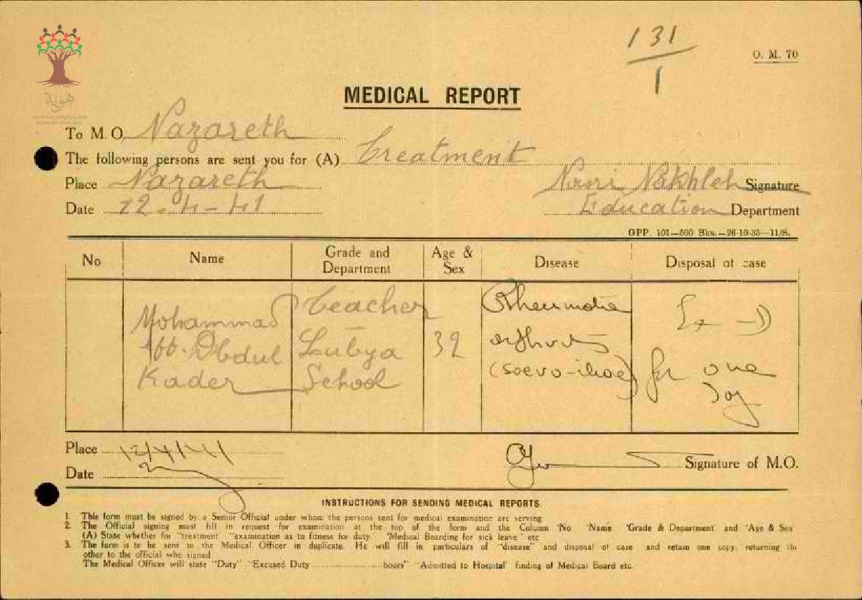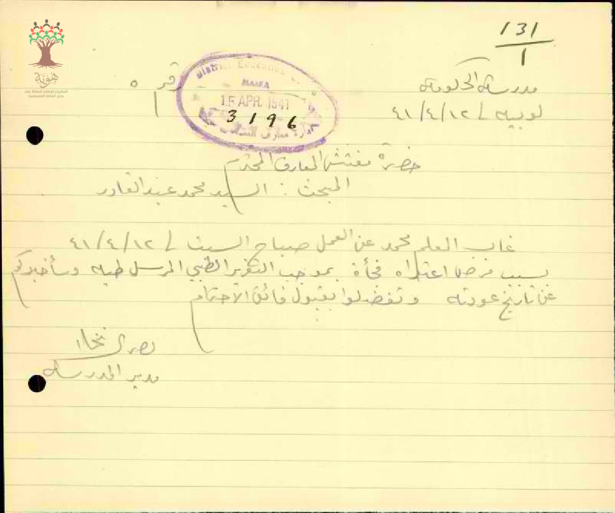 رسالة من مدير مدرسة لوبية إلى مفتش المعارف يعلمه بغياب المعلم محمد عكاشة مرفقاً التقرير الطبي