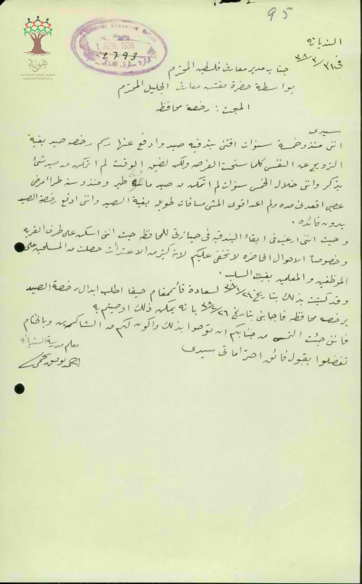 رساله من المعلم احمد توفيق النجمي الى المفتش معارف لواء الجليل بخصوص رخصه بندقية صيد