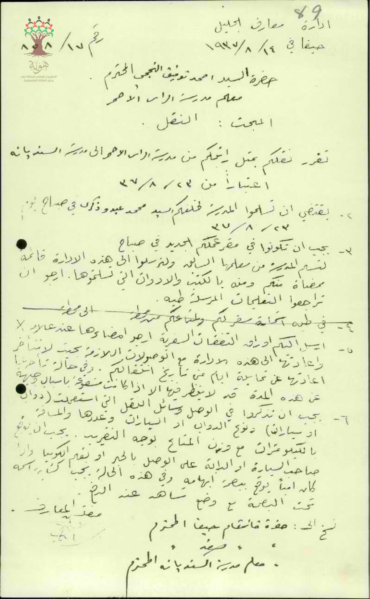 نقل المعلم احمد النجمي من مدرسة الراس الاحمر الى مدرسة السنديانة اعتبار من 23/8/1937نقل المعلم احمد النجمي من مدرسة الراس الاحمر الى مدرسة السنديانة اعتبار من 23/8/1937