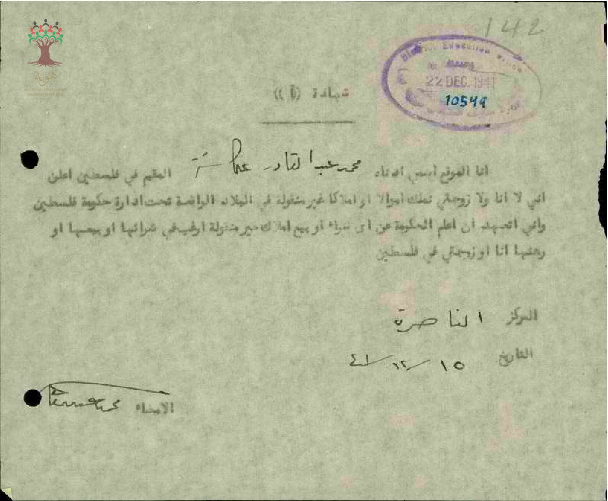 شهادة أ نفي ملكية للمعلم محمد عكاشة /الناصرة