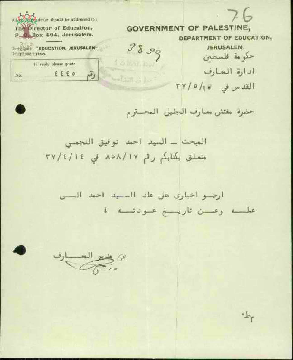 رسالة من مدير المعارف إلى مفتش المعارف بخصوص عودة المعلم أحمد النجمي إلى عمله