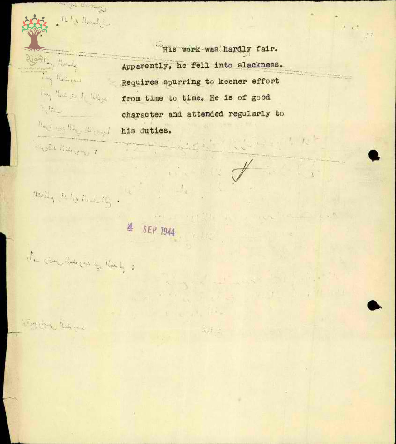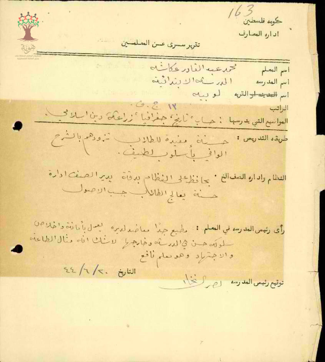 تقرير تفصيلي عن أداء المعلم محمد عكاشة في مدرسة لوبية سنة 1944