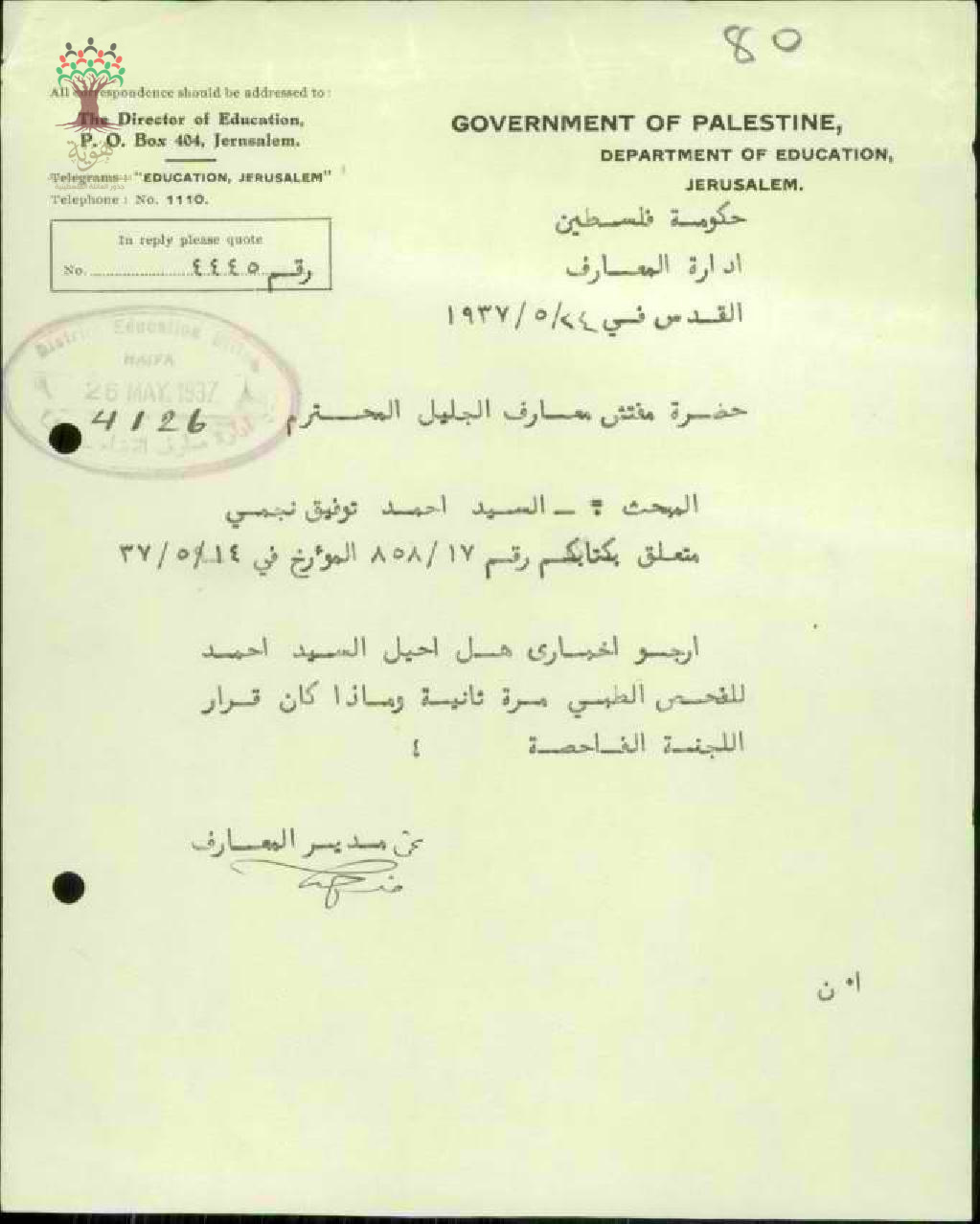 رسالة من مدير معارف الجليل إلى مفتش معارف الجليل بشأن الفحص الطبي للأستاذ أحمد النجمي مرة ثانية