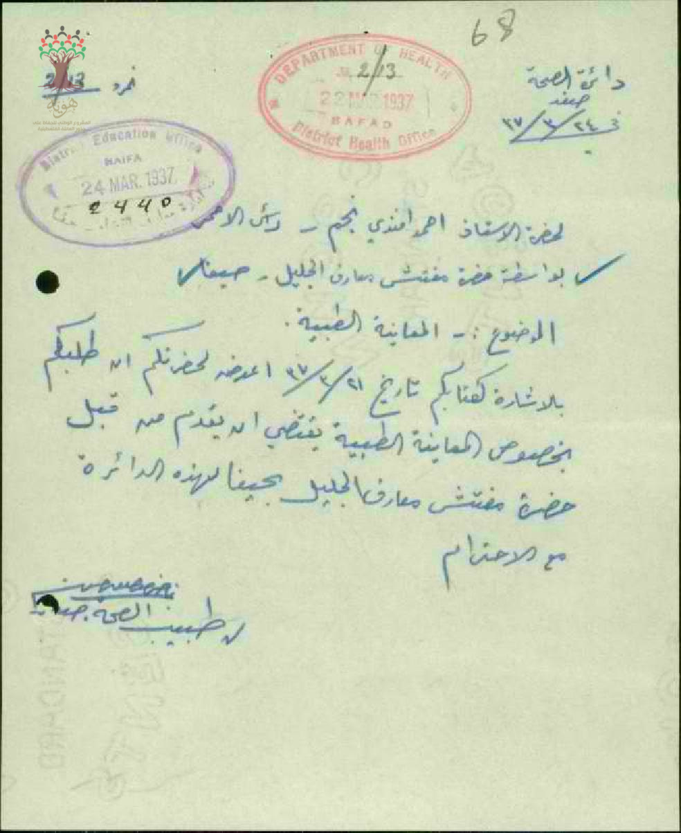 رسالة من طبيب الصحة إلى مفتش معارف الجليل بخصوص معاينة الأستاذ أحمد النجمي