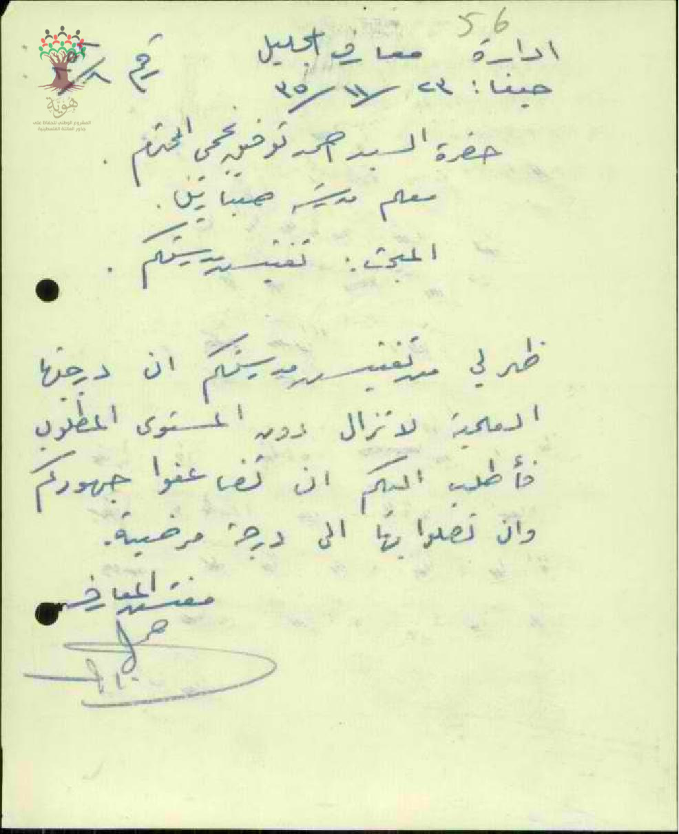 رسالة من مدير معارف الجليل إلى مفتش معارف الجليل بخصوص تفتيش المدرسة في قرية صبارين