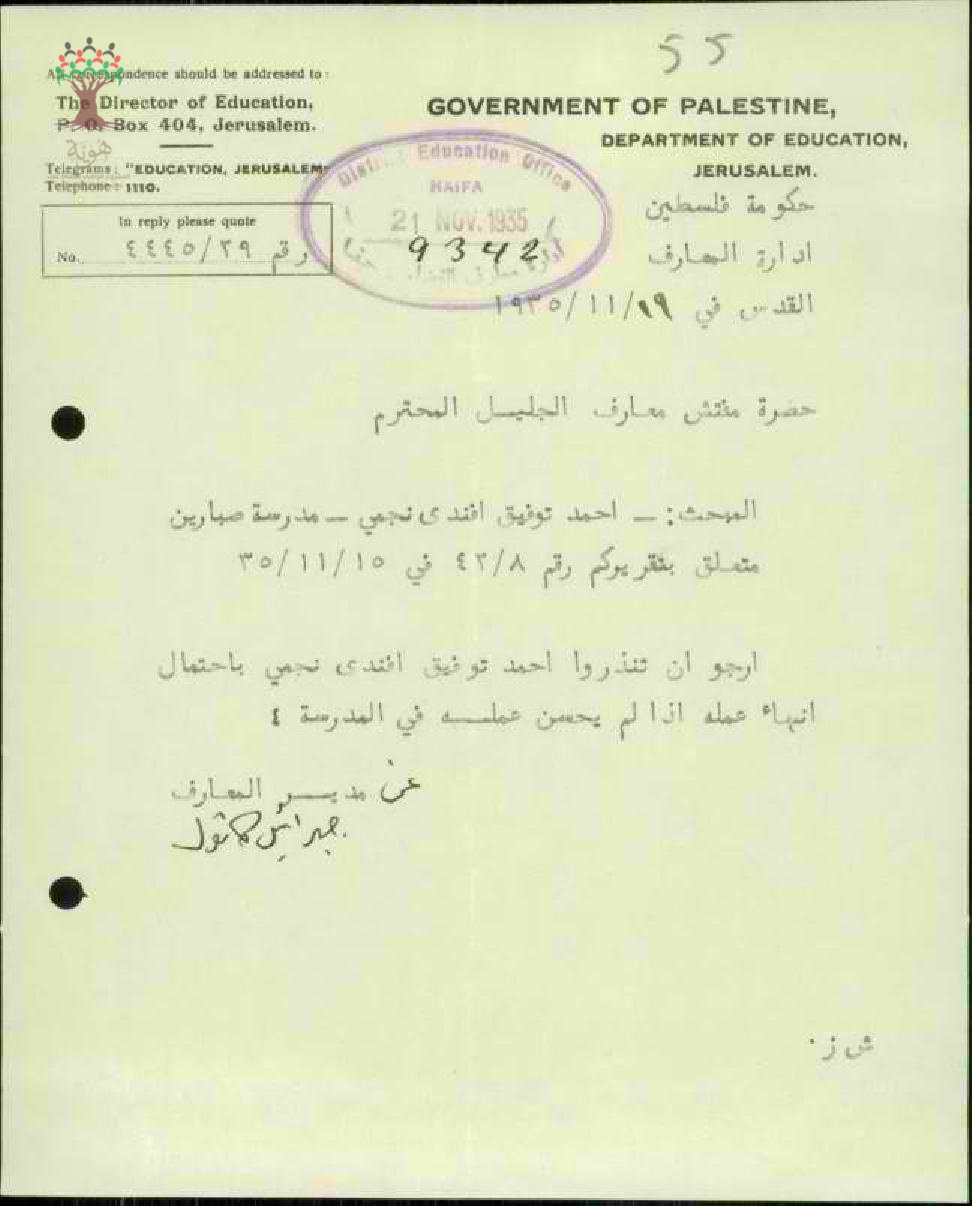 رسالة من معارف الجليل إلى مفتش معارف الجليل بخصوص إنذار للمعلم أحمد النجمي بسبب أهماله