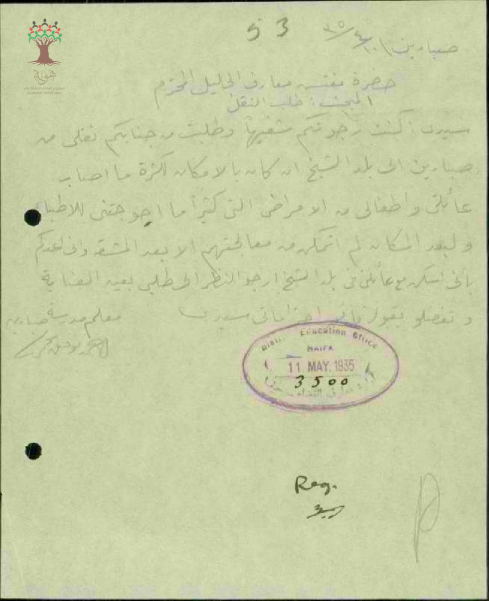 رسالة من المعلم أحمد النجمي إلى مدير المعارف بخصوص نقله من بلدة صبارين إلى بلدة الشيخ