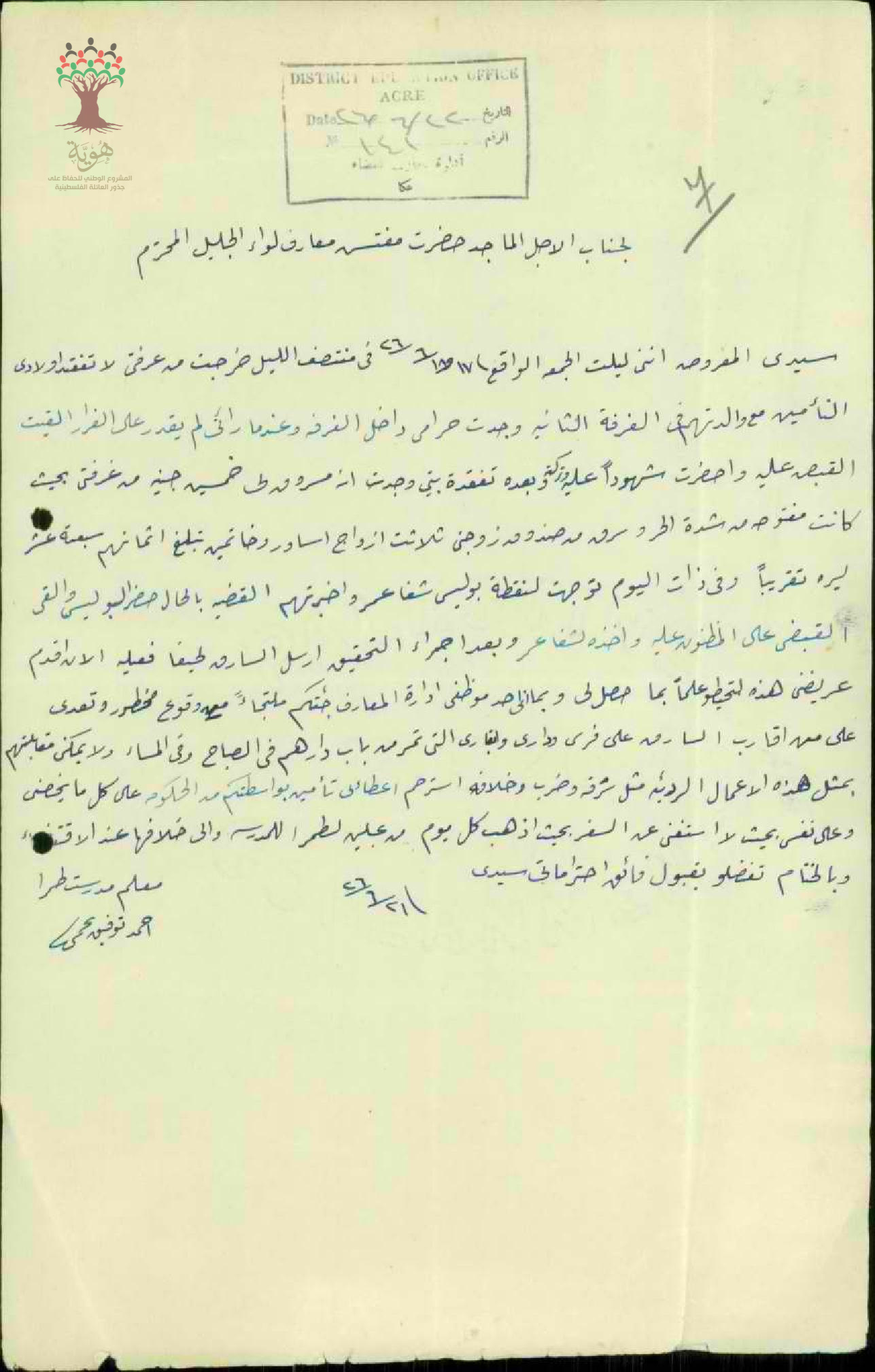 رساله من المعلم احمد توفيق النجمي الى حضرة مفتش المعرف لواء الجليل بخصوص وجود حرامي داخل منزله