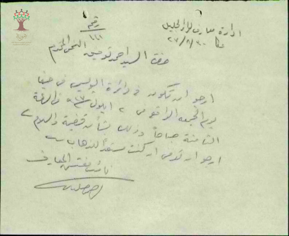رساله من حضرة مفتش معارف الواء الجليل الى معلم احمد توفيق النجمي بخصوص الذهاب الى دائرة الويس في حيفا