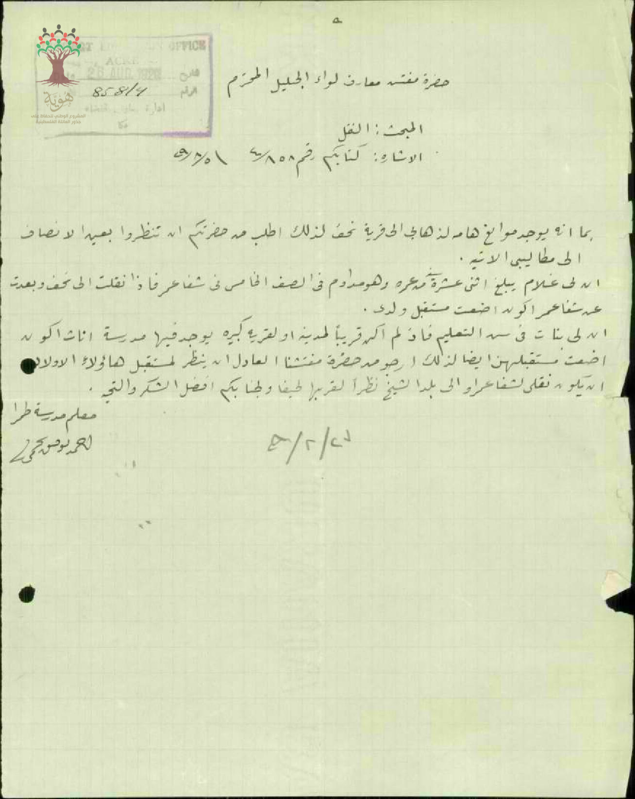 رسالة من المعلم أحمد النجمي إلى إدارة معارف الجليل بخصوص موافقة النقل إلى قرية نحف