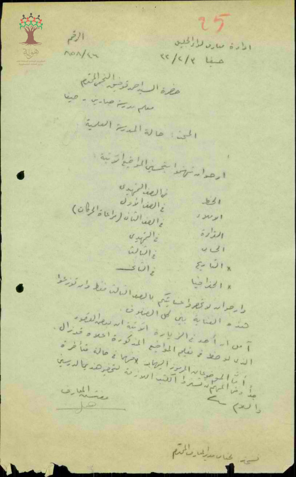 رساله من المعلم احمد توفيق النجمي الى معلم مدرسة صابرين حيفا بخصوص عمله في المدرسة