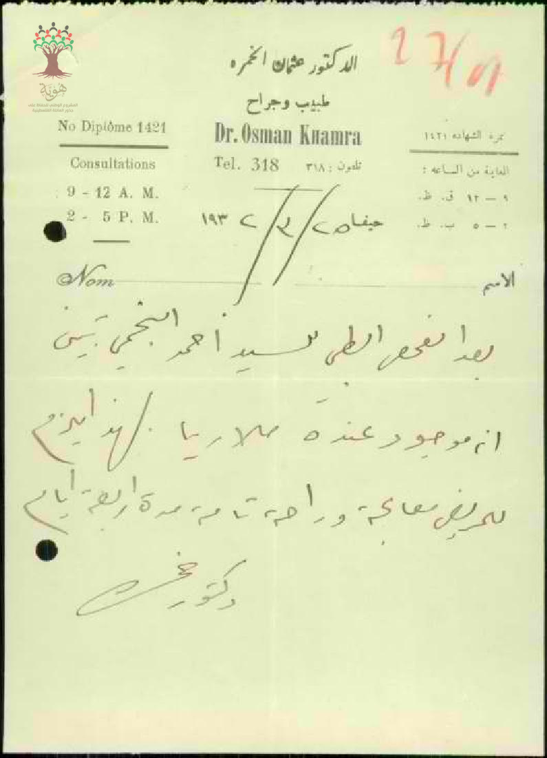 تقرير طبي من المعلم احمد توفيق النجمي الى حضرة مفتش معارف لواء الجليل بخصوص مرضه