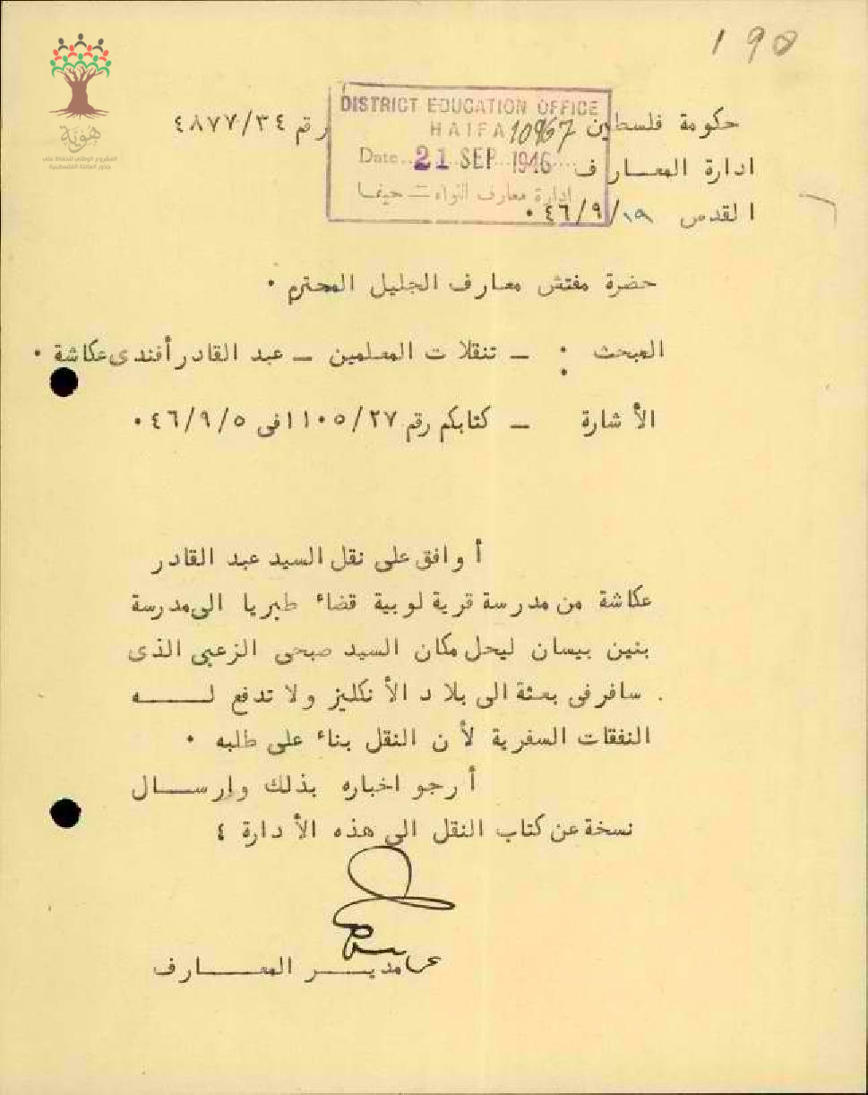 رسالة من مدير المعارف إلى مفتش المعارف يوافق فيها على نقل المعلم محمد عكاشة من مدرسة لوبية إلى مدرسة بيسان