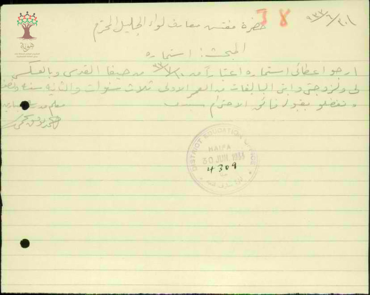 رساله من المعلم احمد توفيق النجمي الى حضرة مفتش معارف الواء الجليل بخصوص اعضائي استمارة ولزوجتي وابني