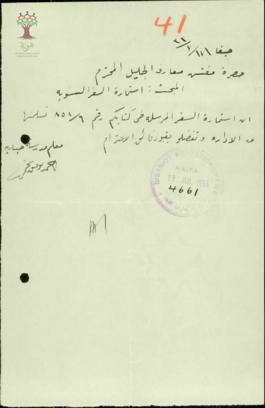 رساله من المعلم احمد توفيق النجمي الى حضرة معارف لواء الجليل بخصوص الموافق عاى استمارة السفر السنوية