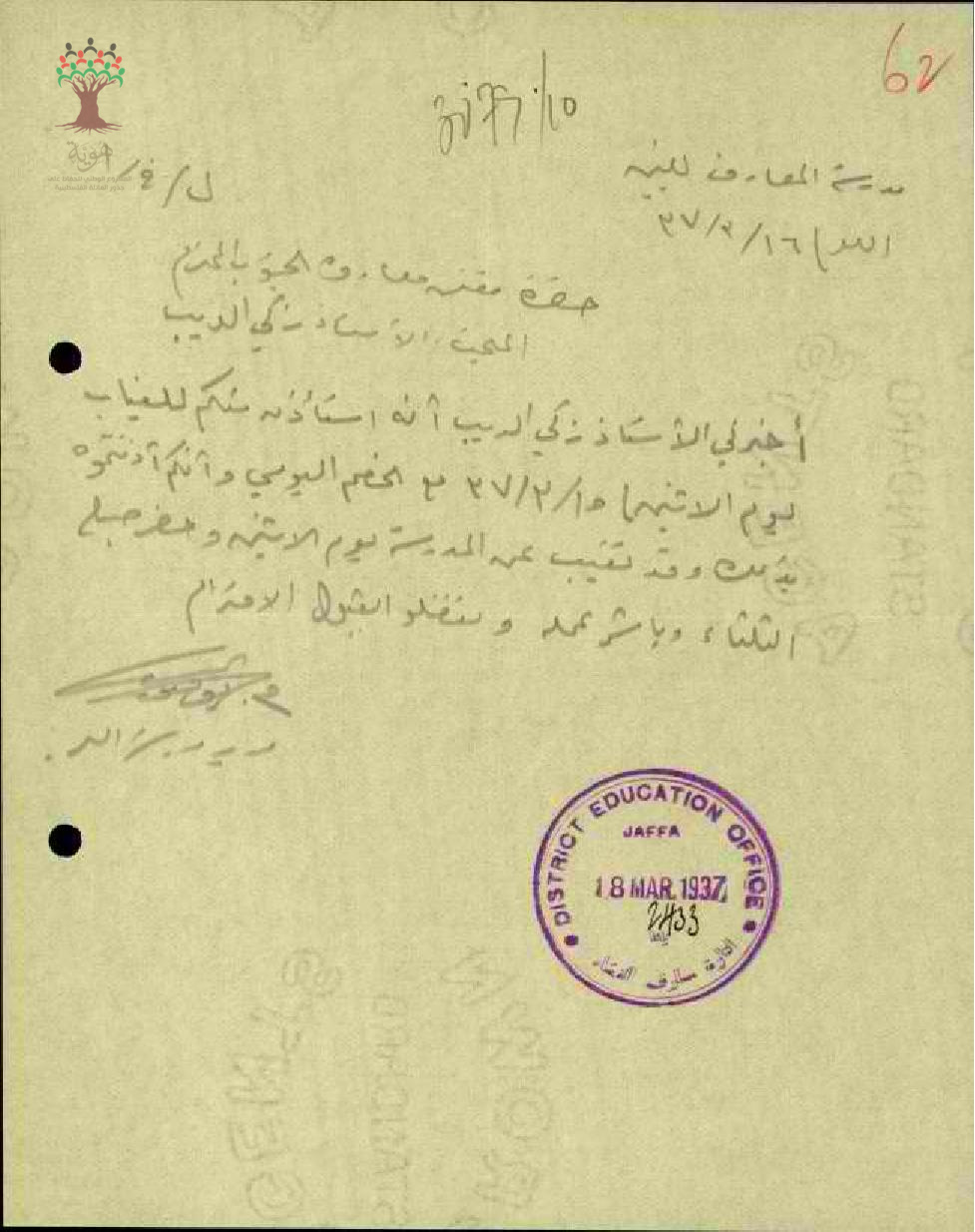 رسالة من مدير مدرسة اللد الى مفتش المعارف بخصوص تغيب المعلم زكي ديب