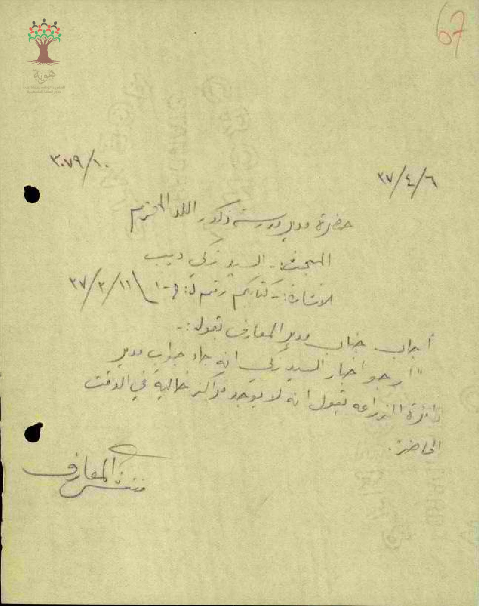رسالة من مفتش المعارف الى المعلم زكي ديب يخبره بعدم وجود مراكز لتعيينه في دائرة الزراعة