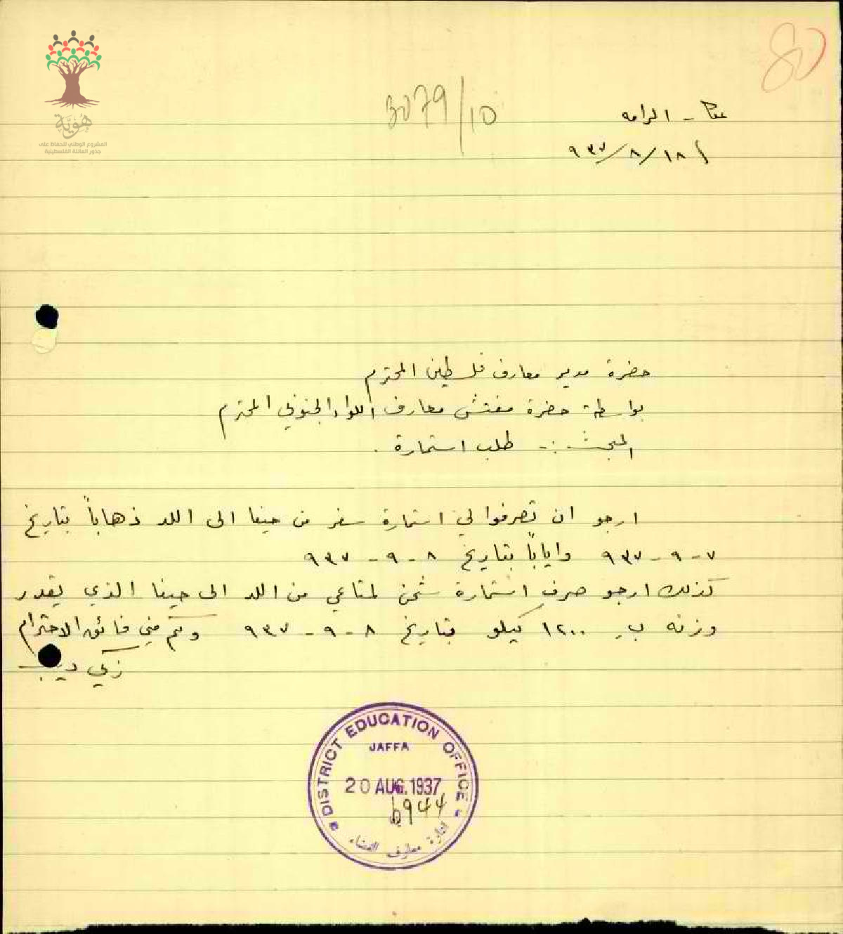 رسالة من المعلم زكي ديب الى مفتش المعارف يطلب فيها استمارته السنوية