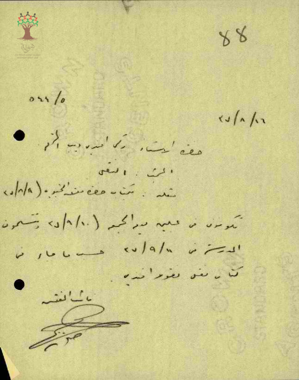 رسالة من مفتش المعارف الى المعلم زكي ديب يعلمه بتاريخ استلام عمله في مدرسة عبلين