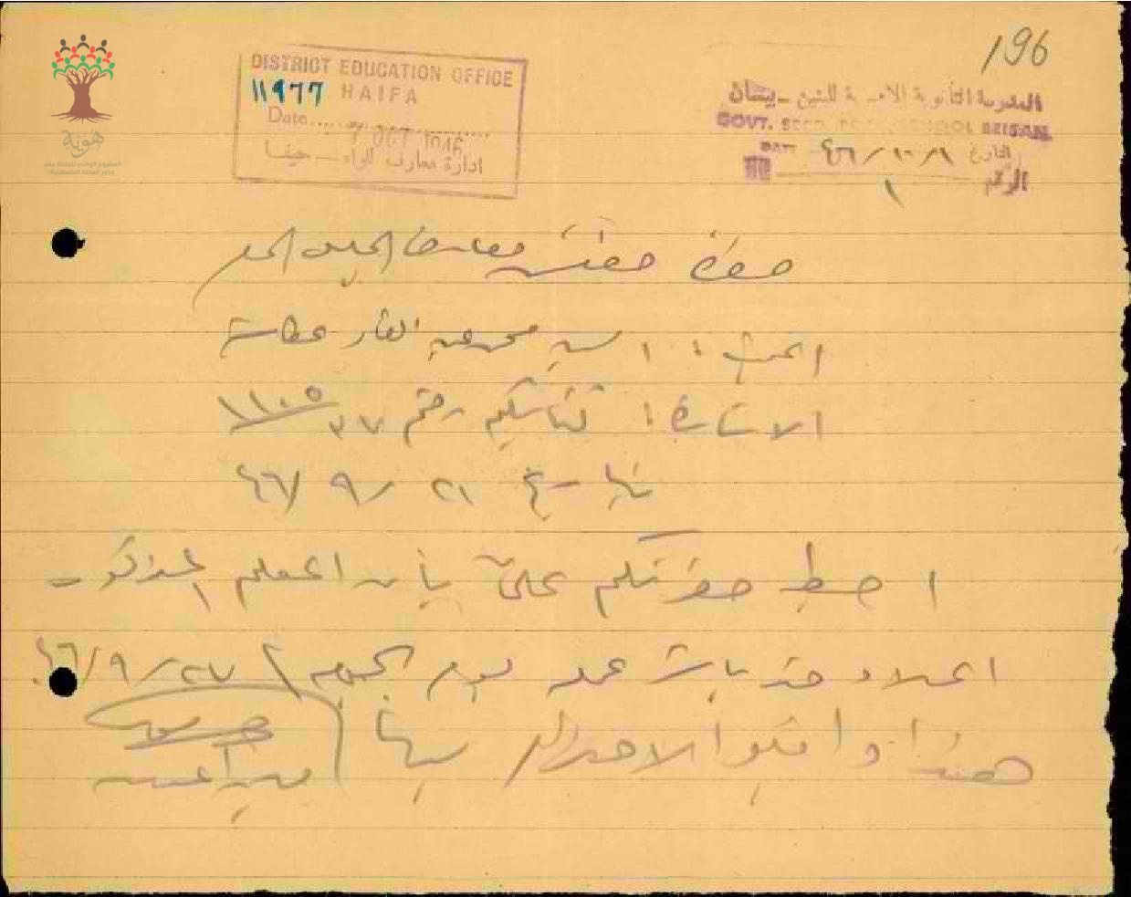 رسالة من مدير مدرسة بيسان إلى مفتش المعارف يعلمه بمباشرة المعلم محمد عكاشة عمله في تاريخ 27/9/1946