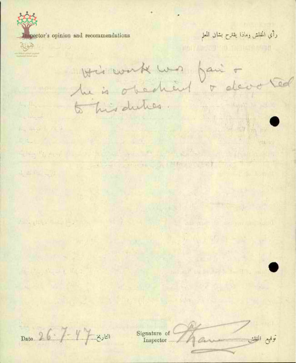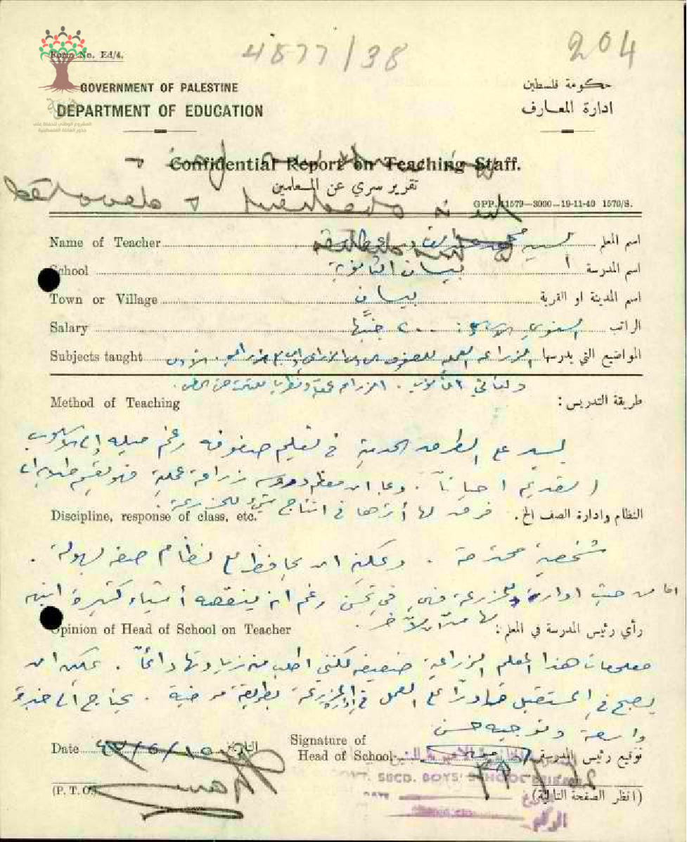 تقرير تفصيلي عن أداء المعلم محمد عكاشة في مدرسة بيسان سنة 1947