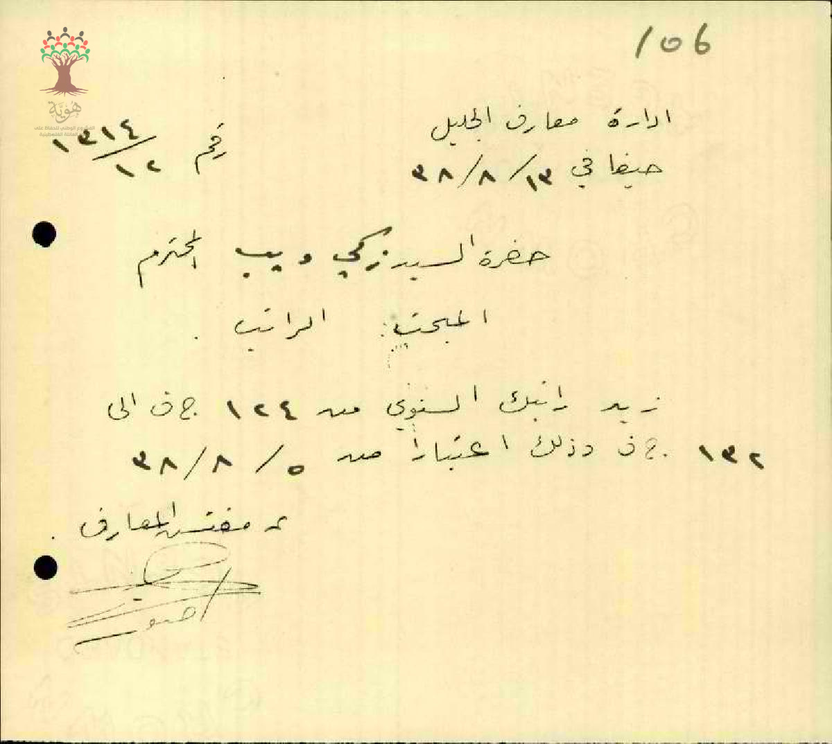 رسالة من مفتش المعارف الى المعلم زكي ديب بخصوص زيادة راتبه