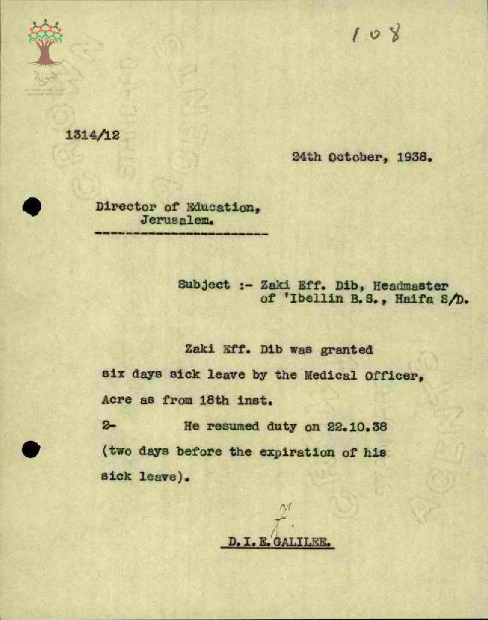 رسالة من مفتش المعارف الى مدير المعارف بخصوص اجازة مرضية للمعلم زكي ديب وعودته للعمل