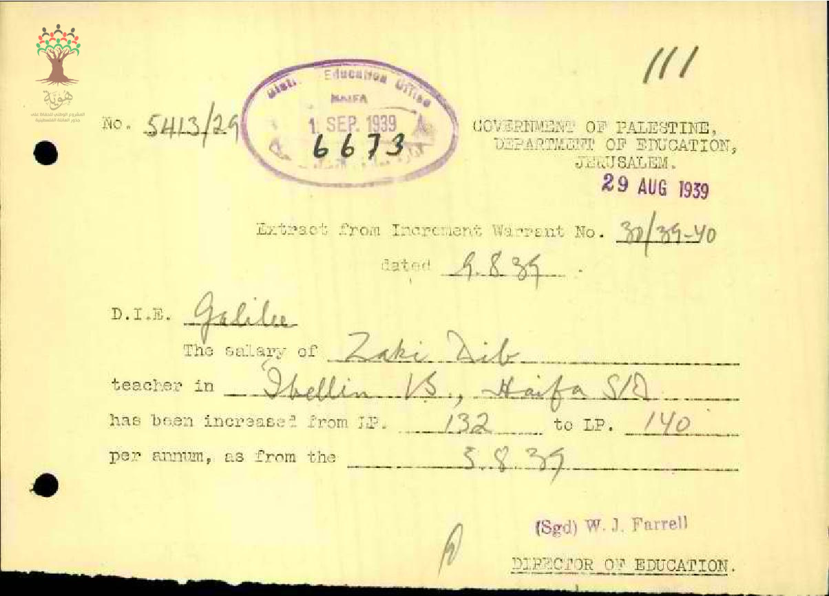 رسالة من مدير المعارف الى مفتش المعارف بخصوص زيادة راتب المعلم زكي ديب السنوية