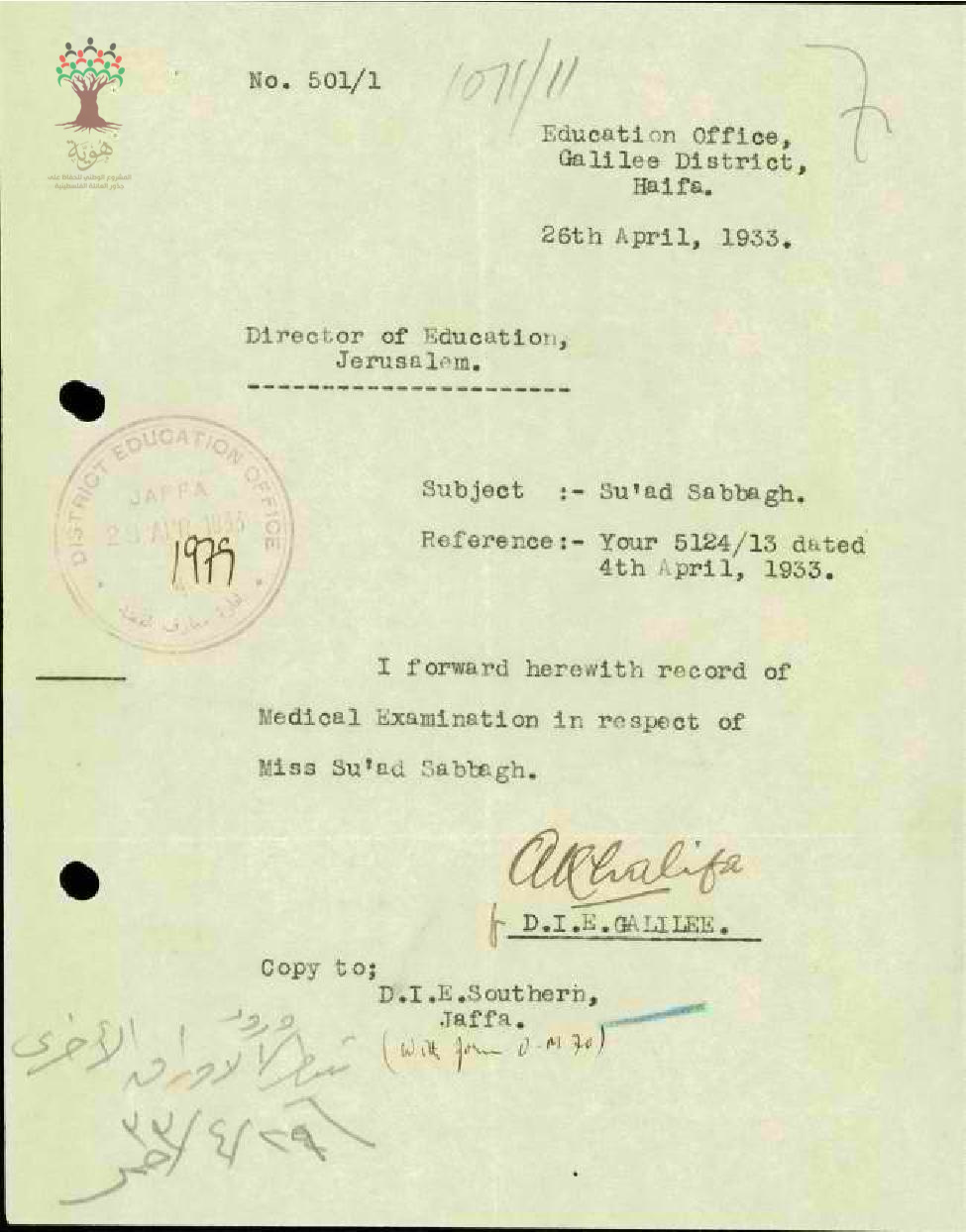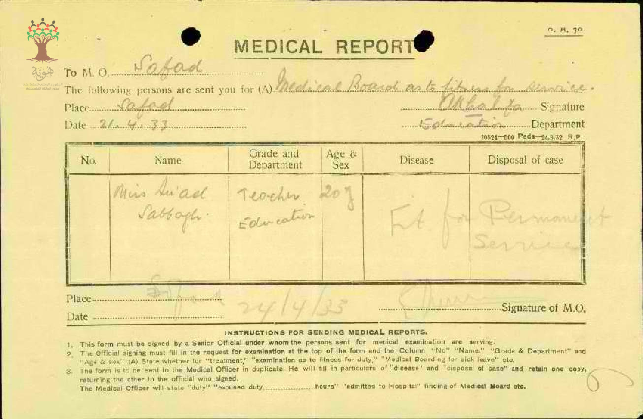 رسالة من مفتش المعارف إلى مدير المعارف يرسل فيها التقرير الطبي لتعيين المعلمة سعاد صباغ