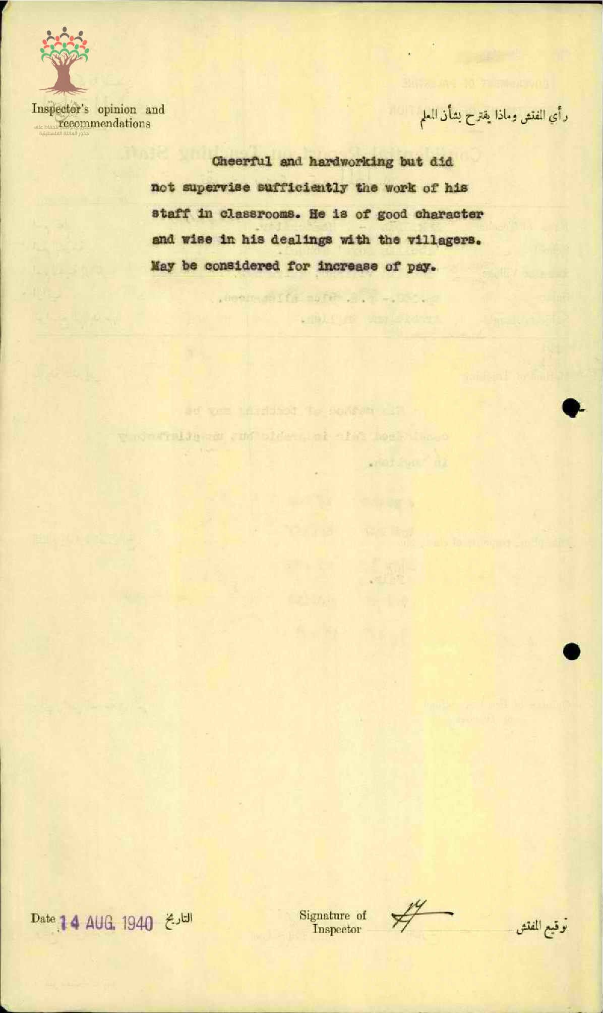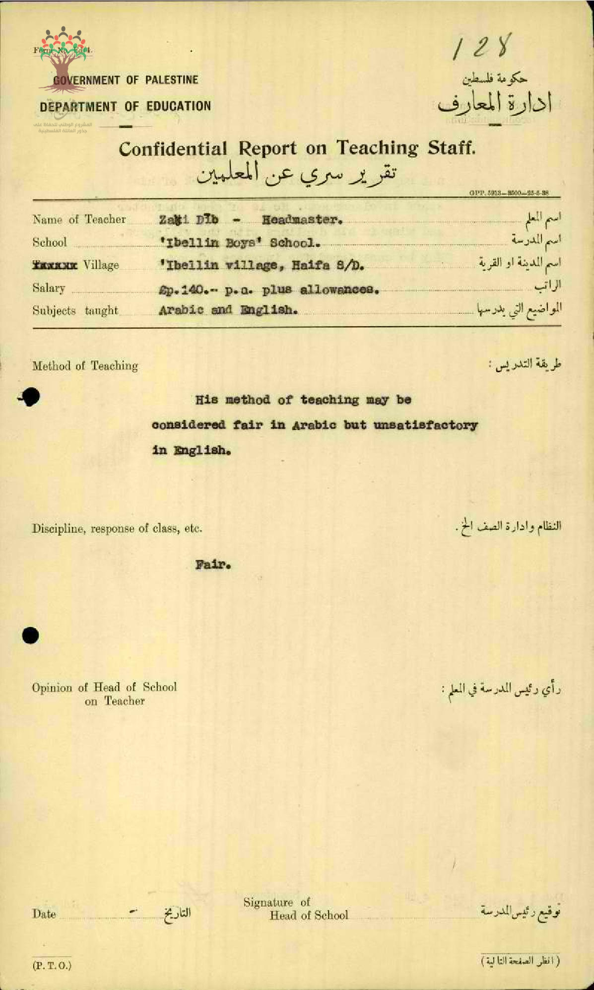 تقرير تفصيلي عن أداء المعلم زكي ديب في مدرسة عبلين سنة 1940