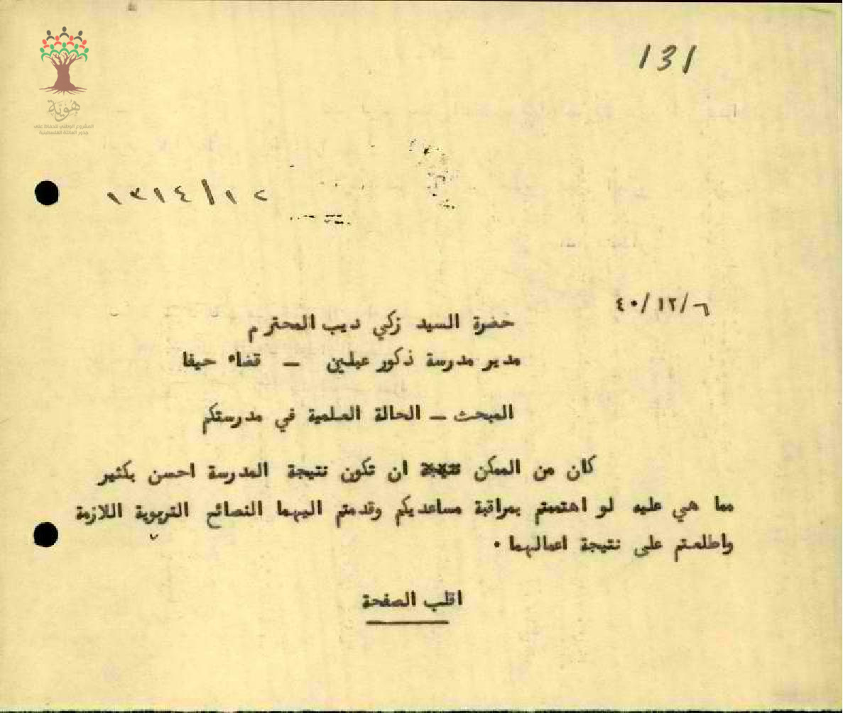 رسالة من مفتش المعارف الى المعلم زكي ديب بخصوص الحالة العلمية في المدرسة