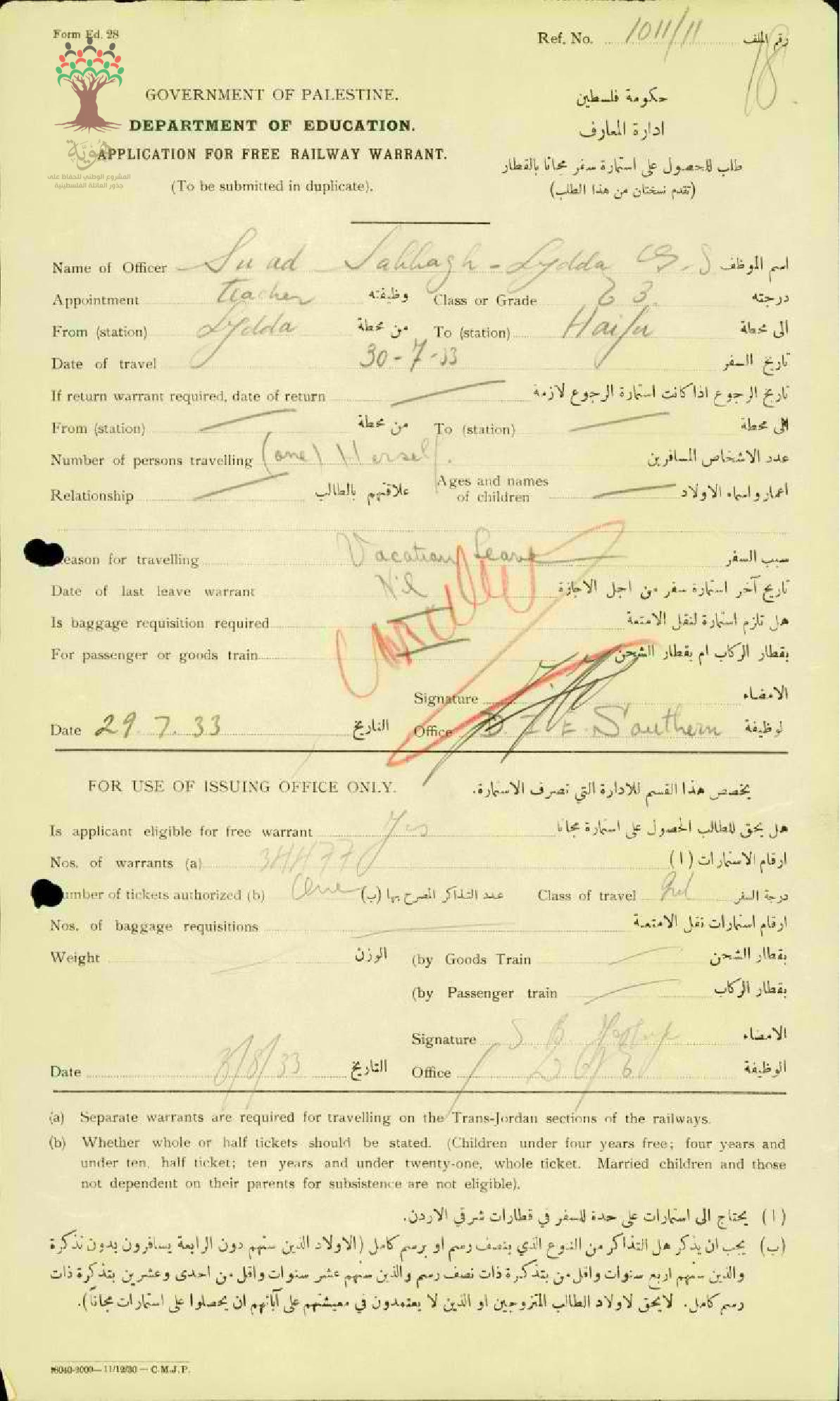 طلب للحصول على استمارة سفر مجاناً بالقطار للمعلمة سعاد صباغ