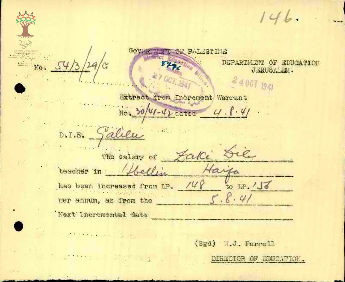 رسالة من مدير المعارف الى مفتش المعارف بخصوص زيادة راتب المعلم زكي ديب السنوية