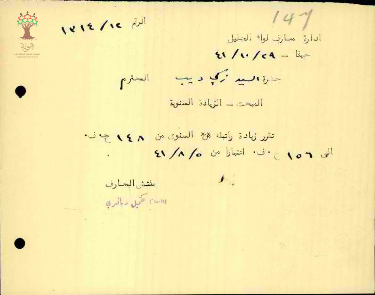 رسالة من مفتش المعارف الى المعلم زكي ديب بخصوص زيادة راتبه