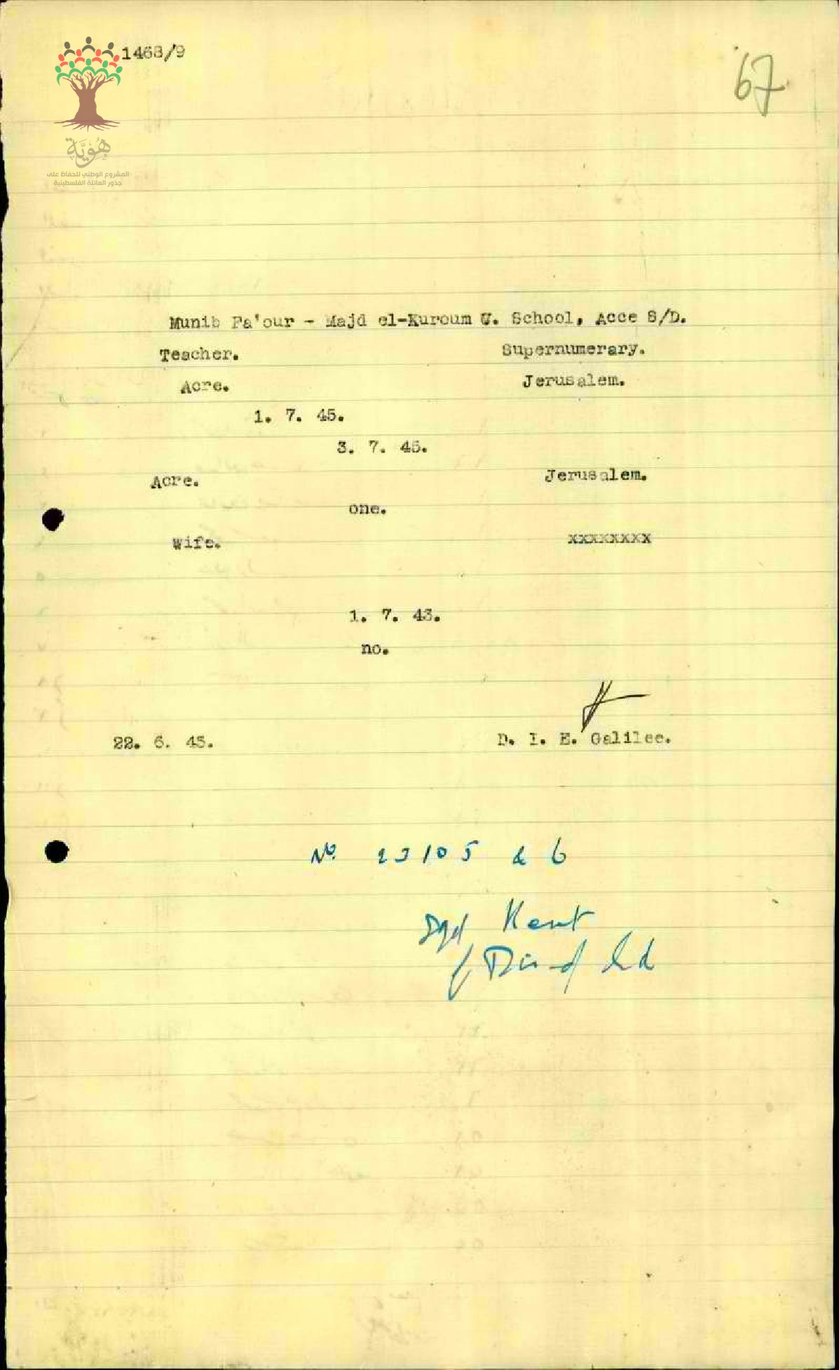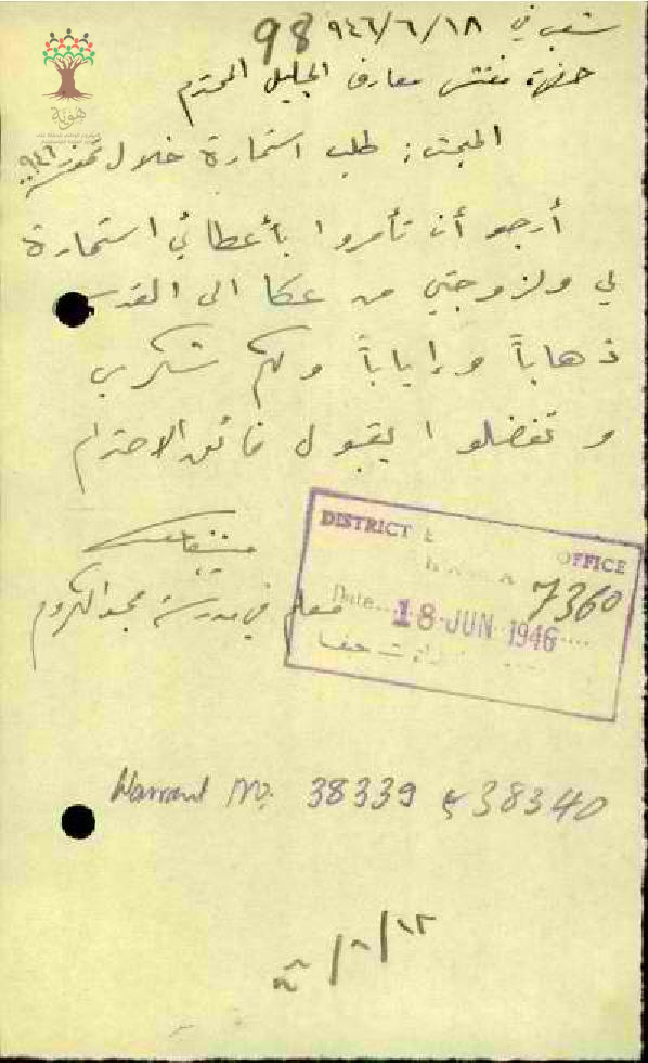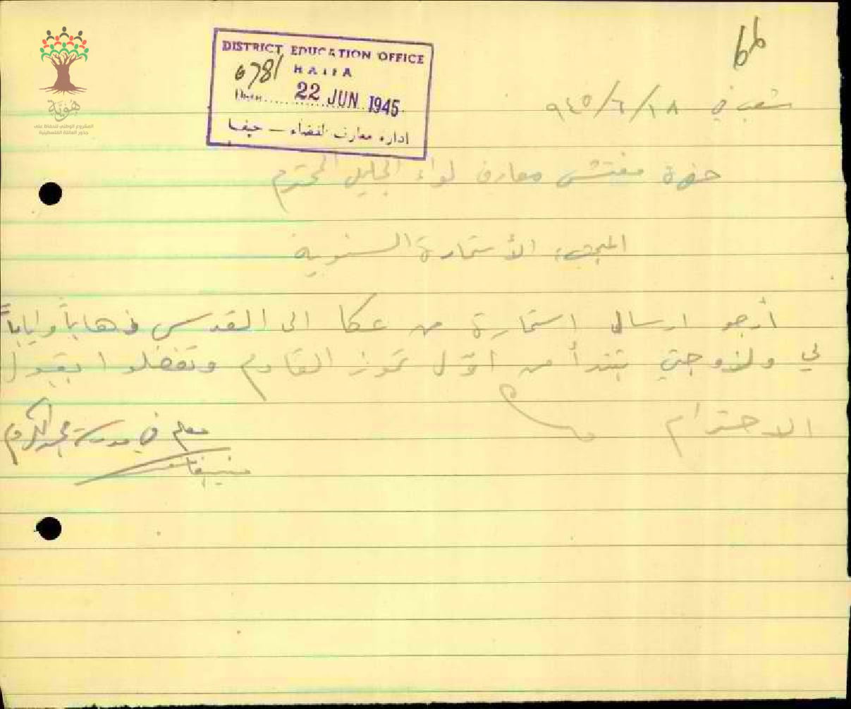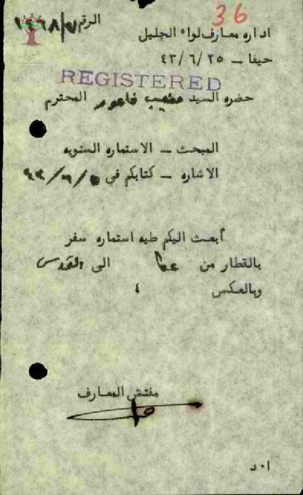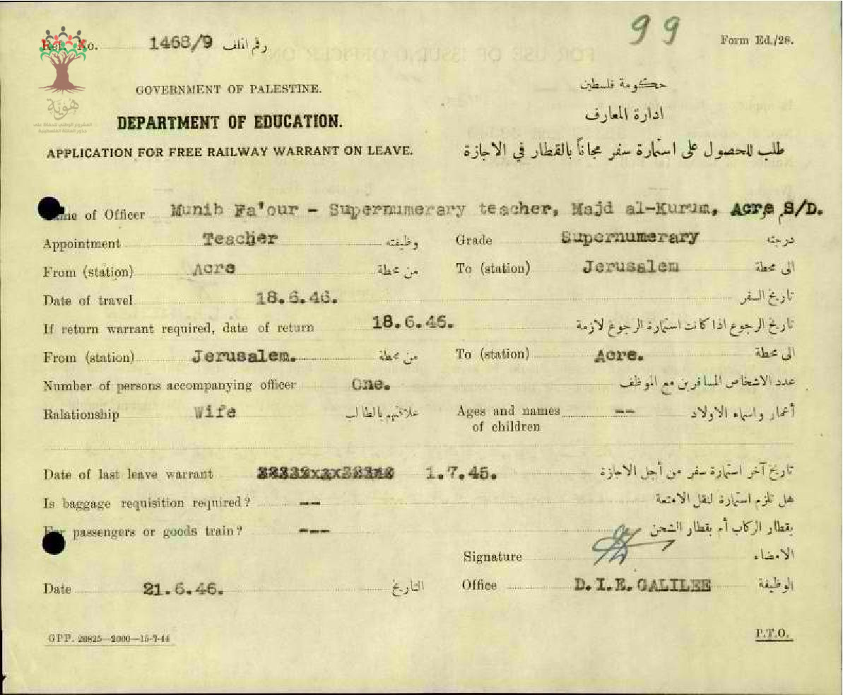 وثائق تُبين فيها طلب المعلم منيب فاعور الحصول على استمارة سفر من عكا للقدس ذهاباً وإياباً مجانا في فترة الاجازة
