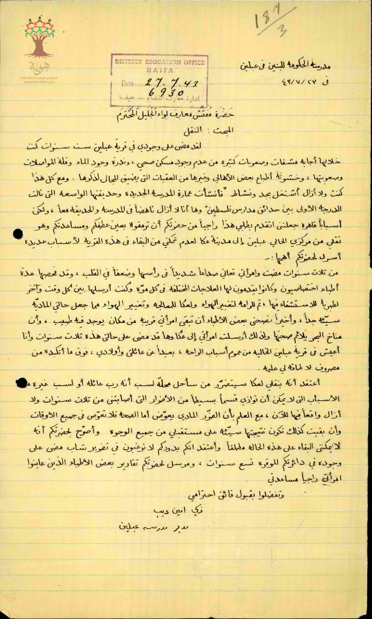 رسالة من المعلم زكي ديب الى مفتش المعارف يطلب نقله من مدرسة عبلين