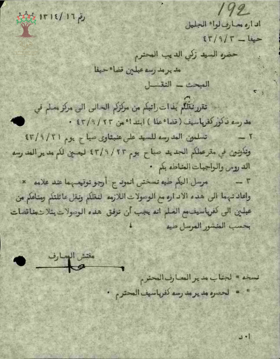 نقل المعلم زكي ديب من مدرسة عبلين للذكور الى مدرسة ذكور كفر ياسيف قضاء عكا
