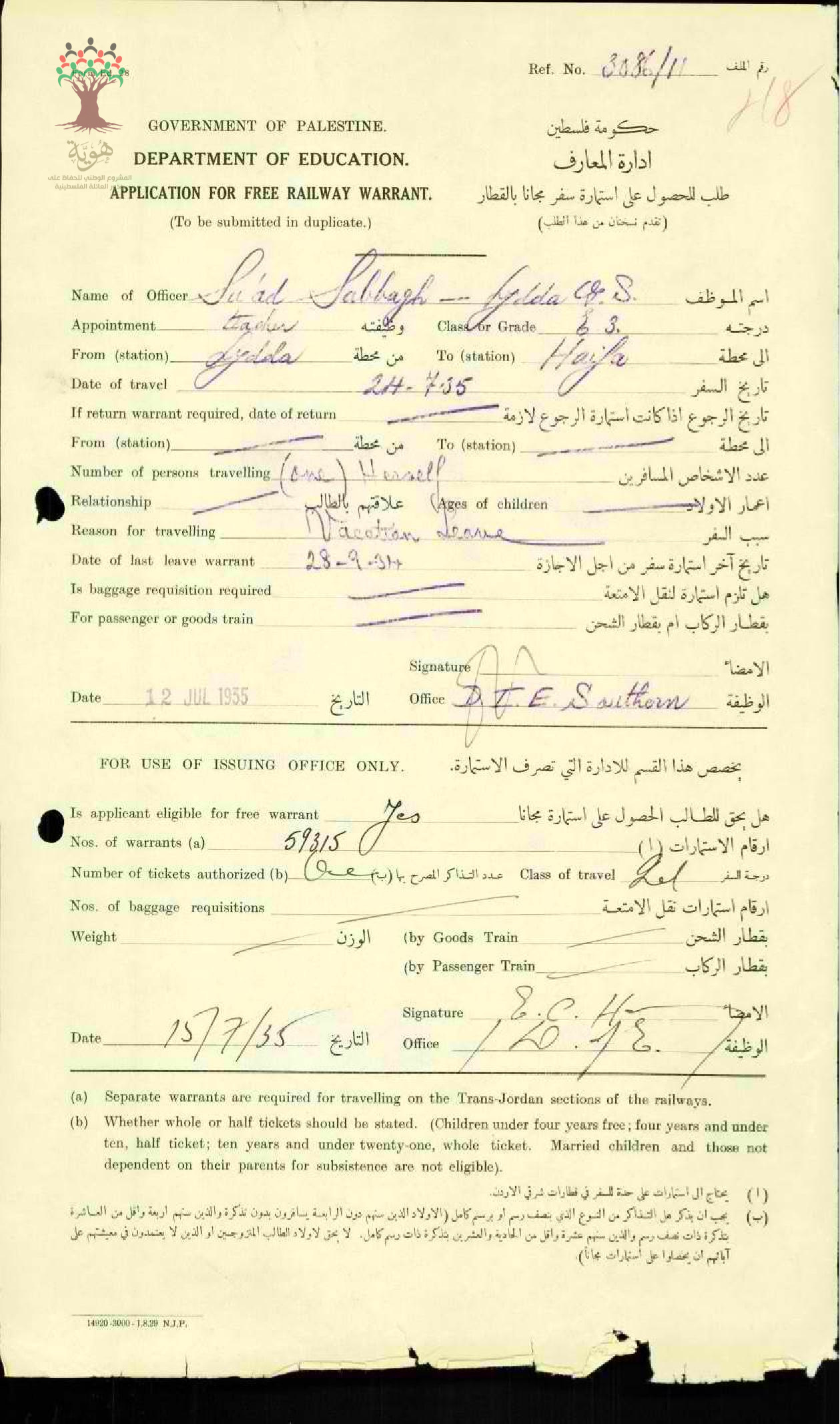 طلب استمارة سفر مجاناً بالقطار للمعلمة سعاد صباغ
