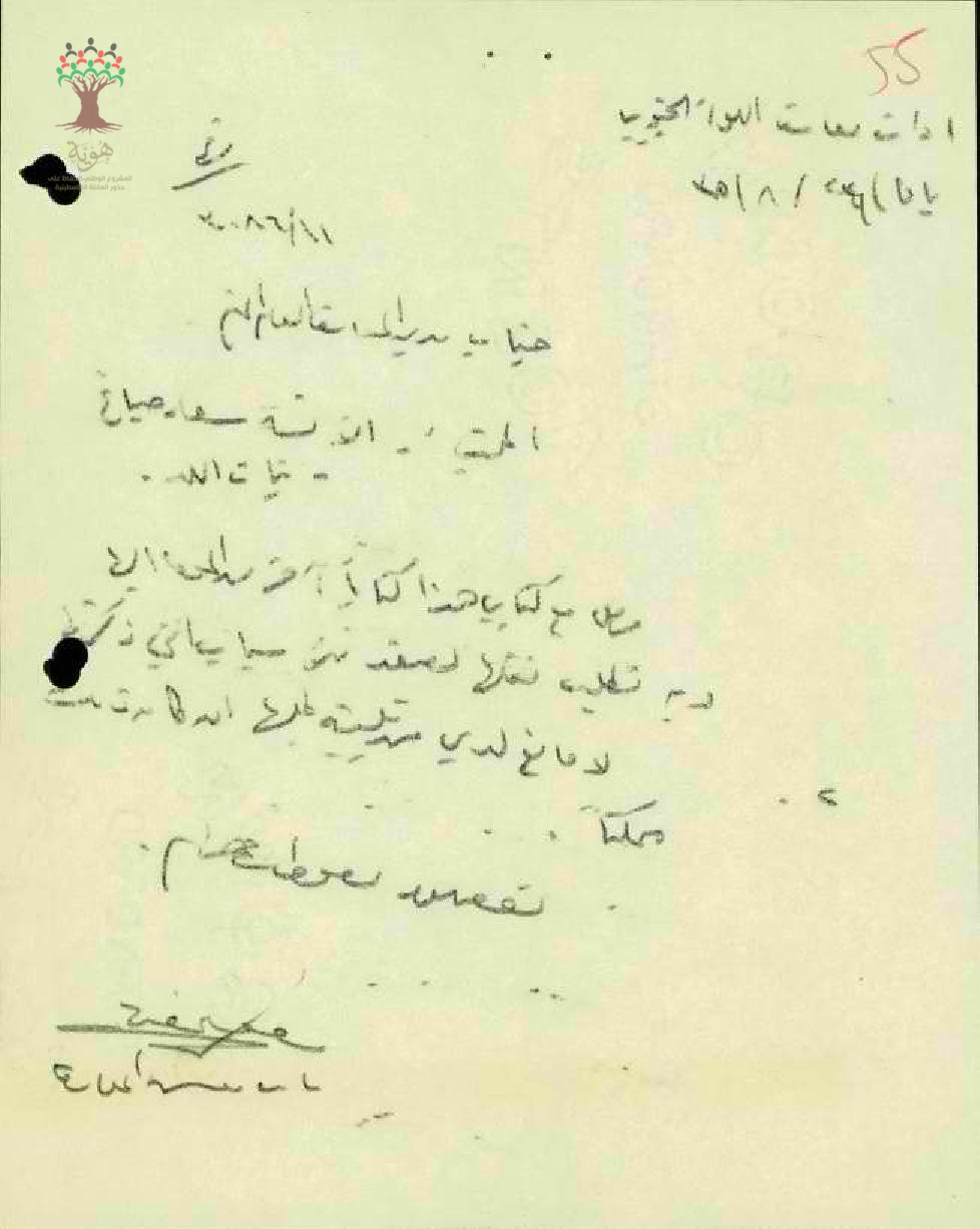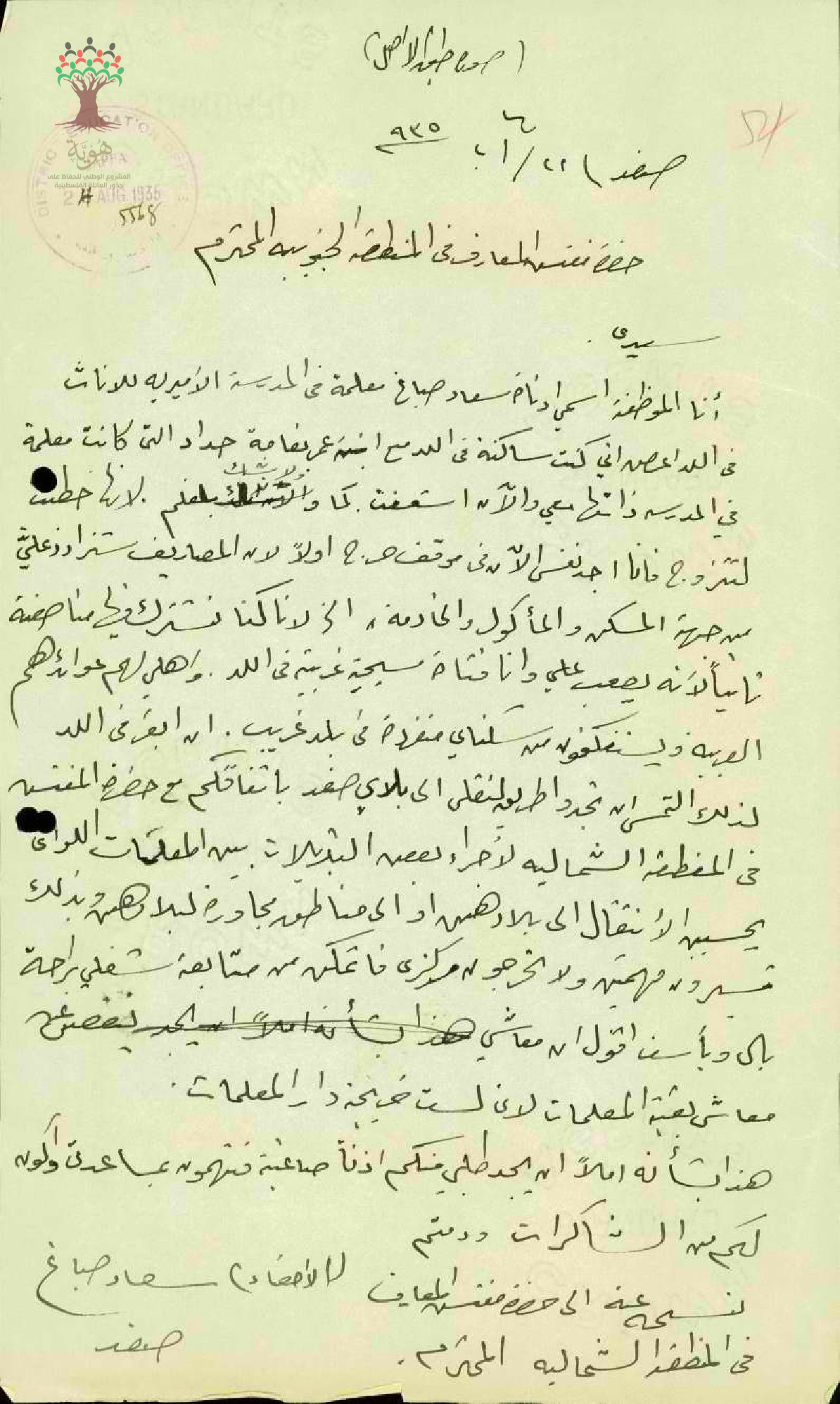 رسالة من المعلمة سعاد صباغ إلى مفتش المعارف تطلب نقلها من اللد مع ذكر الأسباب