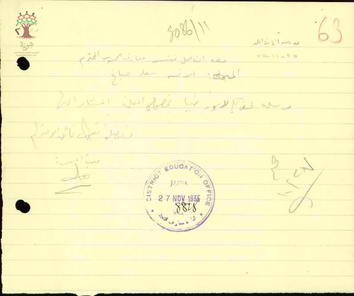 رسالة من مديرة مدرسة بنات اللد إلى مفتش المعارف تخبره بغياب المعلمة سعاد صباغ بموجب تقرير طبي