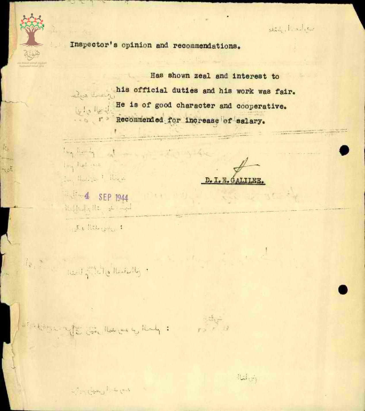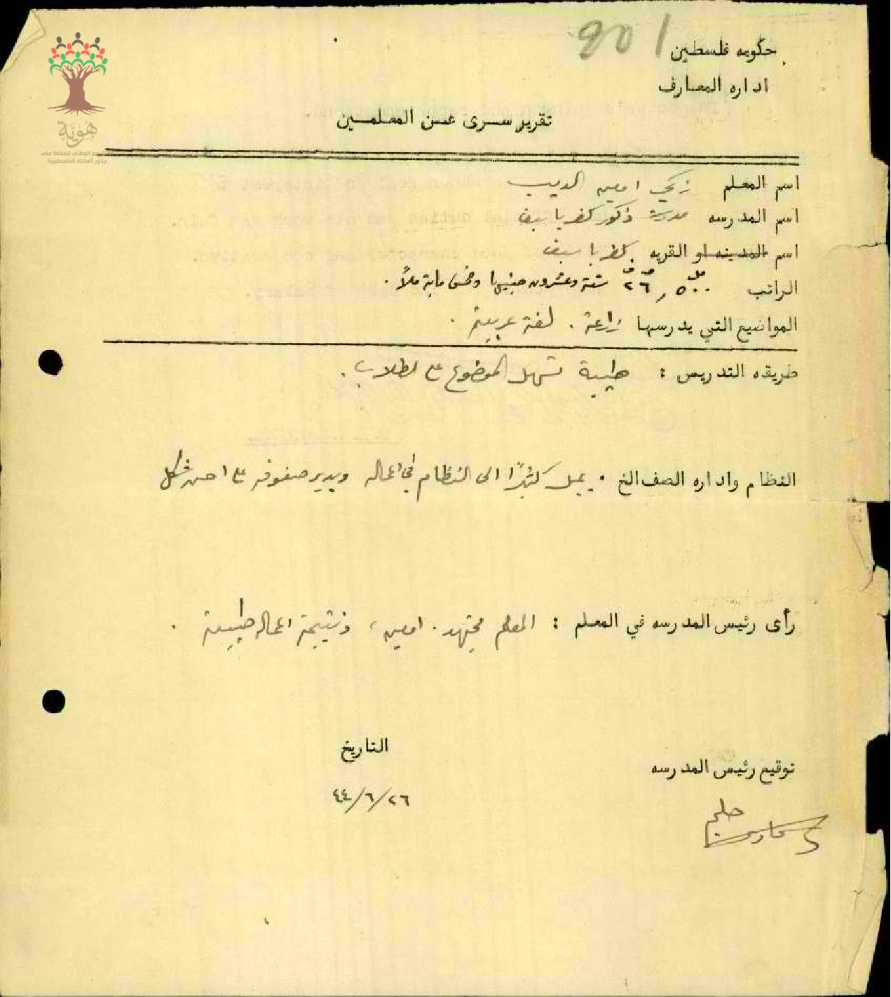 تقرير تفصيلي عن أداء المعلم زكي ديب في مدرسة كفر ياسيف سنة 1944