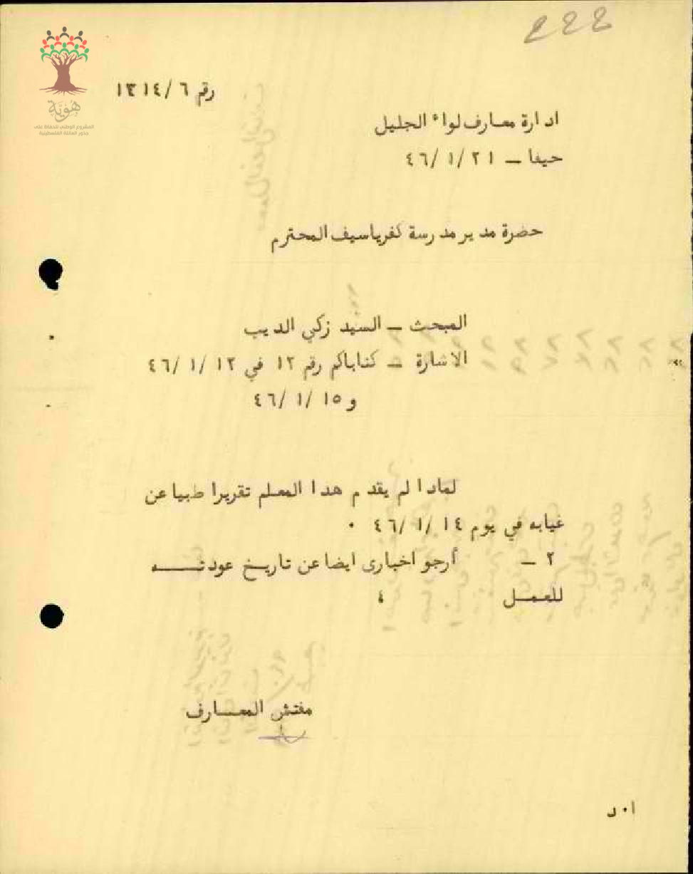 رسالة من مفتش المعارف الى مدير مدرسة كفر ياسيف يبحث معه موضوع تغيب المعلم زكي ديب