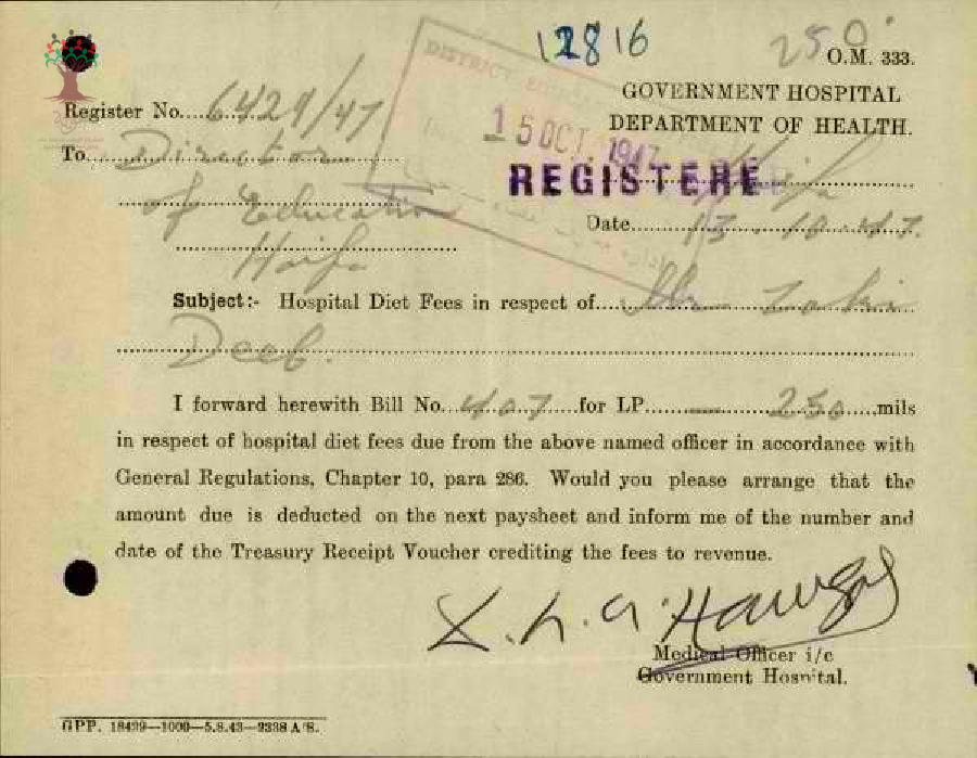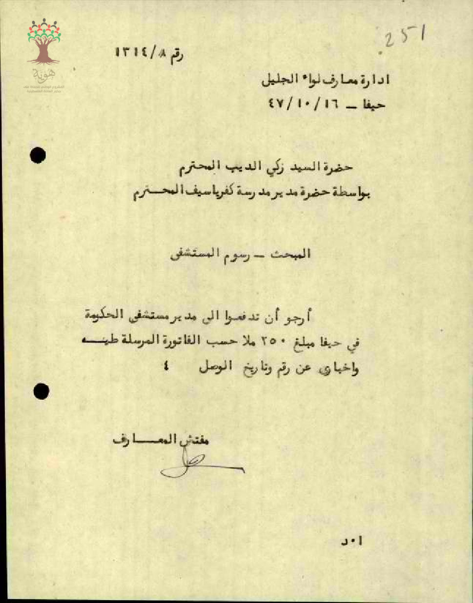 رسالة من مفتش المعارف الى مدير المعارف بخصوص دفع فاتورة المستشفى المرفقة للمعلم زكي ديب