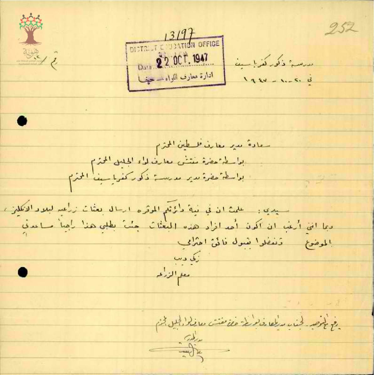 رسالة من المعلم زكي ديب الى مفتش المعارف يطلب فيها أن يكون ضمن البعثة الزراعية الى بلاد الانجليز