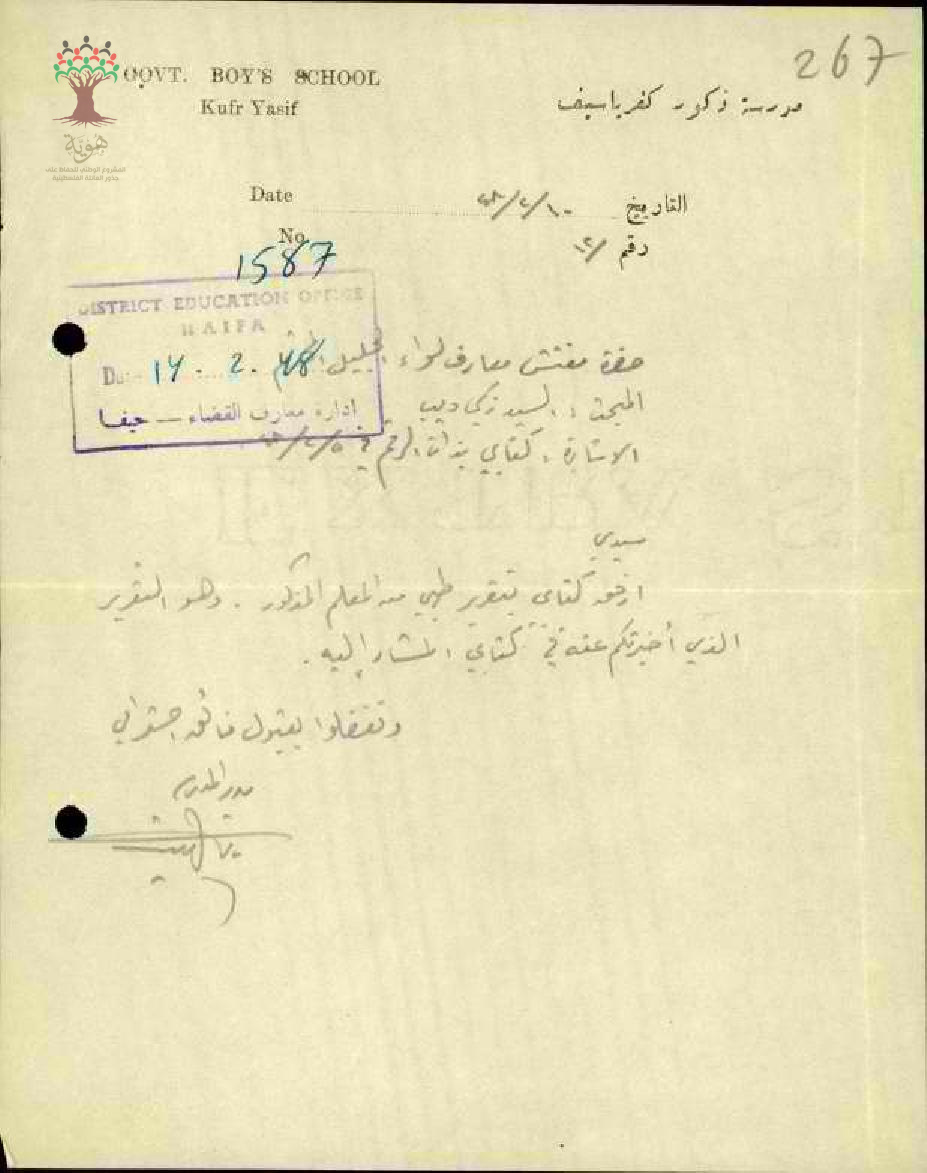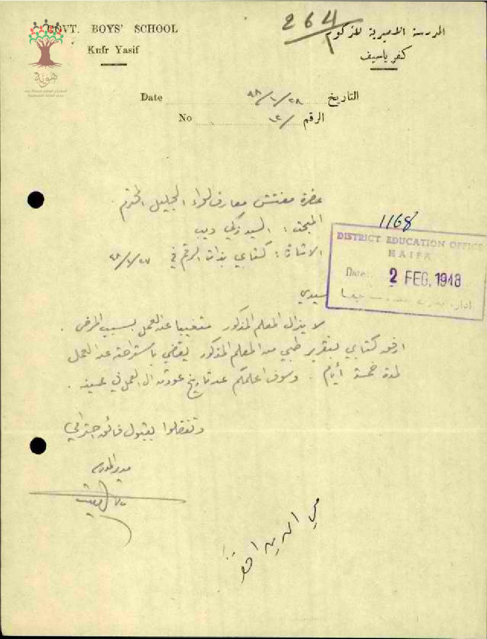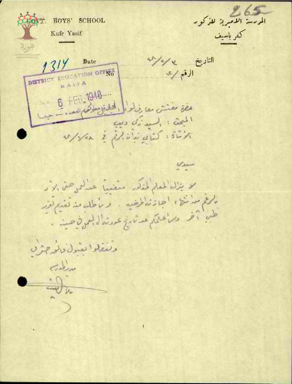 رسائل من مدير مدرسة كفر ياسيف الى مفتش المعارف بخصوص تغيب المعلم زكي ديب عن العمل بسبب المرض وعودته للعمل