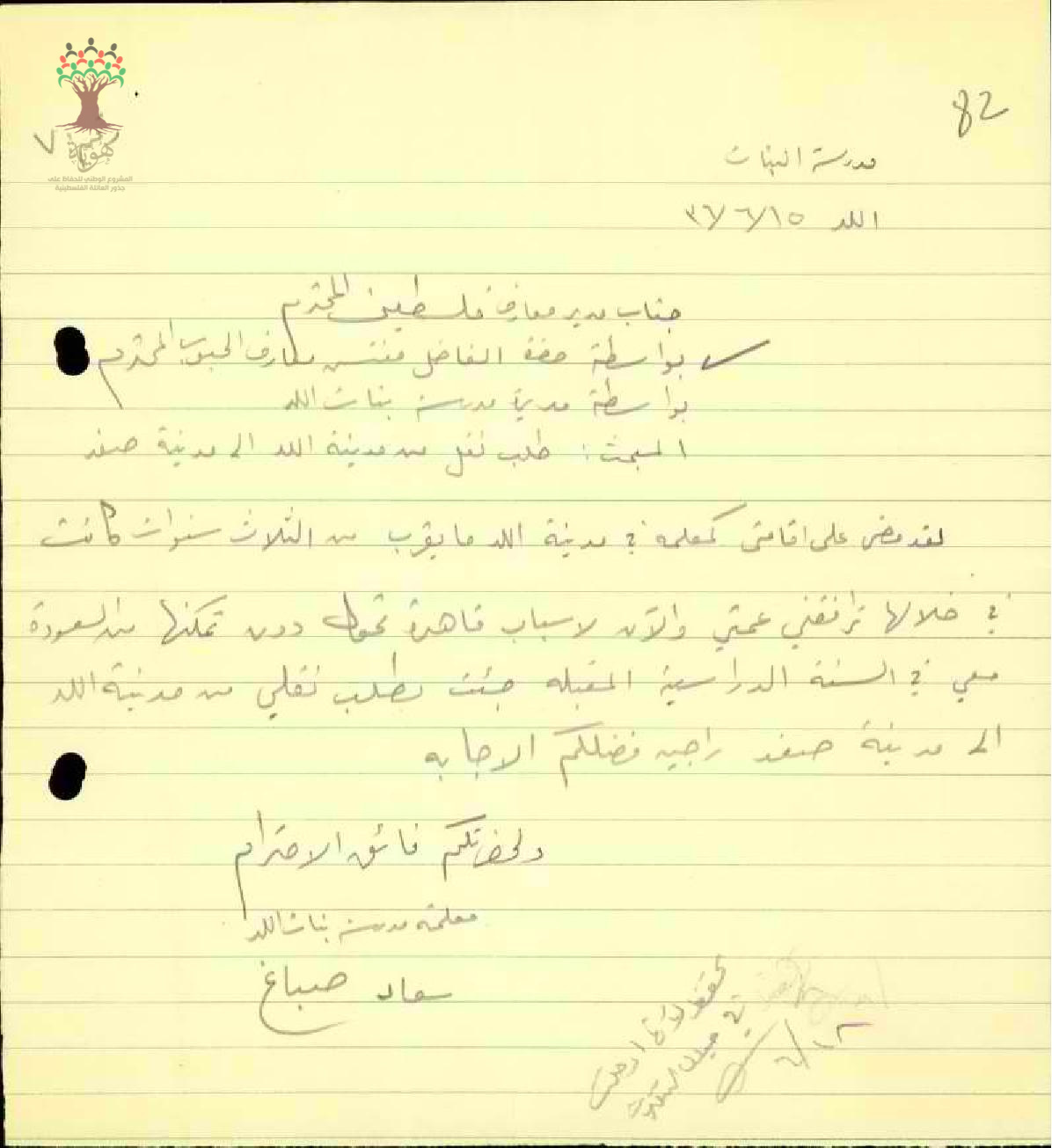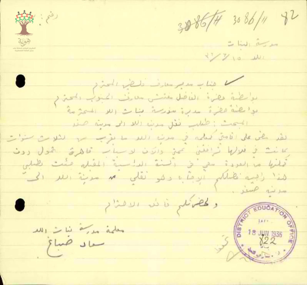 رسالة من المعلمة سعاد صباغ إلى مدير المعارف تطلب نقلها من اللد إلى صفد